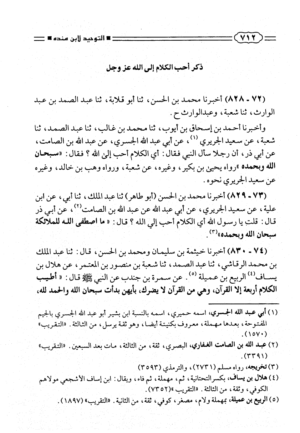 (٧٣ - ٨٢٩) أخبرنا محمد بن الحسن (أبو طاهر) ثنا عبد الملك، ثنا أبى، عن ابن علية، عن سعيد الجريرى، عن أبى عبد الله عن عبد الله بن الصامت (¬٢)، عن أبى ذر قال: قلت يا رسول الله أى الكلام أحب إلى الله؟ قال: «ما اصطفى الله للملائكة سبحان الله وبحمده» (¬٣).