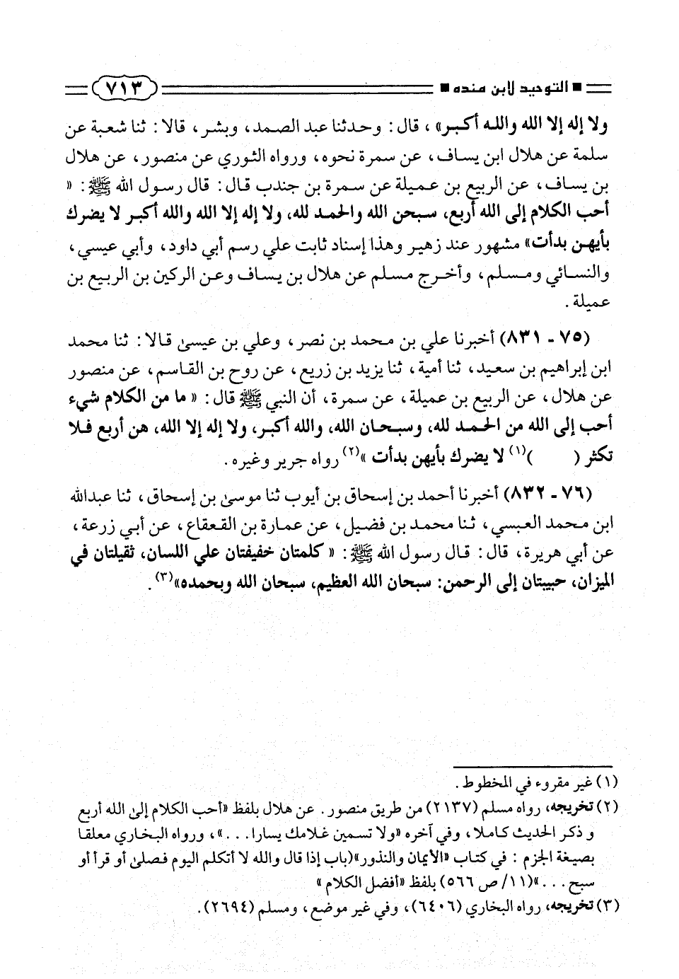 (٧٥ - ٨٣١) أخبرنا على بن محمد بن نصر، وعلى بن عيسى قالا: ثنا محمد ابن إبراهيم بن سعيد، ثنا أمية، ثنا يزيد بن زريع، عن روح بن القاسم، عن منصور عن هلال، عن الربيع بن عميلة، عن سمرة، أن النى صلّى الله عليه وسلم قال: «ما من الكلام شئ أحب إلى الله من الحمد لله، وسبحان الله، والله أكبر، ولا إله إلا الله، هن أربع فلا تكثر (. . .) (¬١) لا يضرك بأيهن بدأت» (¬٢) رواه جرير وغيره.