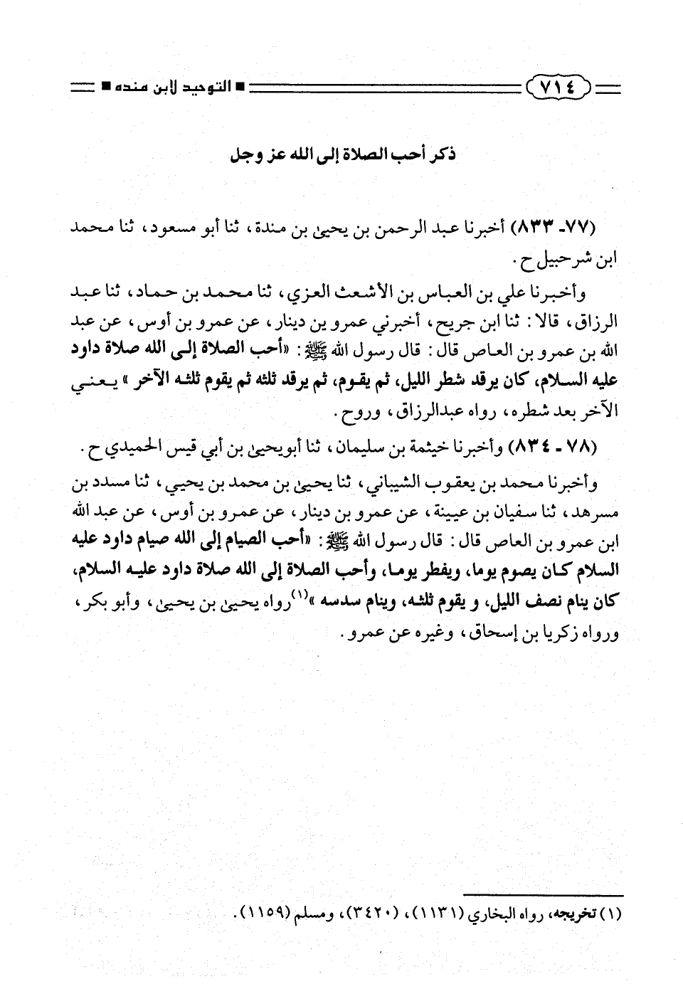 وأخبرنا محمد بن يعقوب الشيبانى، ثنا يحيى بن محمد بن يحيى، ثنا مسدد بن مسرهد، ثنا سفيان بن عيينة، عن عمرو بن دينار، عن عمرو بن أوس، عن عبد الله ابن عمرو بن العاص قال: قال رسول الله صلّى الله عليه وسلم: «أحب الصيام إلى الله صيام داود عليه السلام كان يصوم يوما، ويفطر يوما، وأحب الصلاة إلى الله صلاة داود عليه السلام، كان ينام نصف الليل، ويقوم ثلثه، وينام سدسه» (¬١) رواه يحيى بن يحيى، وأبو بكر، ورواه زكريا بن إسحاق، وغيره عن عمرو.