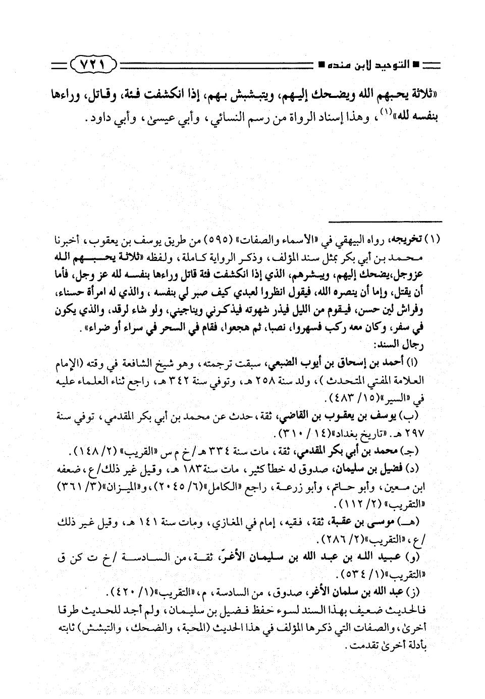 «ثلاثة يحبهم الله ويضحك إليهم، ويتبشبش بهم، إدا انكشفت فئة، وقاتل، ورأها بنفسه لله» (¬١)، وهذا إسناد الرواة من رسم النسائى، وأبى عيسى، وأبى داود.