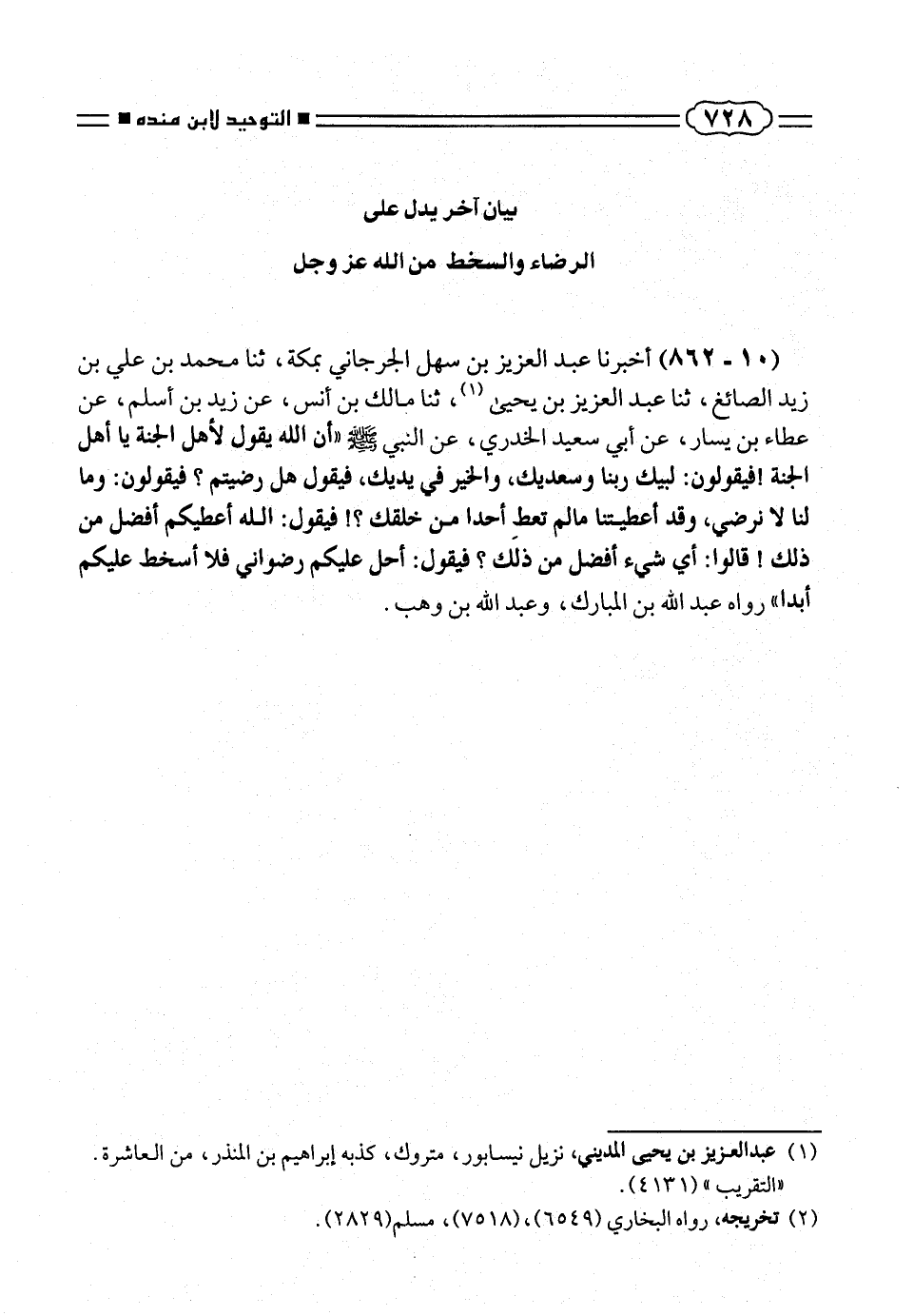 (١٠ - ٨٦٢) أخبرنا عبد العزيز بن سهل الجرجانى بمكة، ثنا محمد بن على بن زيد الصائغ، ثنا عبد العزيز بن يحيى (¬١)، ثنا مالك بن أنس، عن زيد بن أسلم، عن عطاء بن يسار، عن أبى سعيد الخدرى، عن النبى صلّى الله عليه وسلم «أن الله يقول لأهل الجنة يا أهل الجنة! فيقولون: لبيك ربنا وسعديك، والخير فى يديك، فيقول هل رضيتم؟ فيقولون: وما لنا لا نرضى، وقد أعطيتنا مالم تعط أحدا من خلقك؟! فيقول: الله أعطيكم أفضل من ذلك! قالوا: أى شئ أفضل من ذلَك؟ فيقول: أحل عليكم رضوانى فلا أسخط عليكم أبدا» (¬٢) رواه عبد الله بن المبارك، وعبد الله بن وهب.