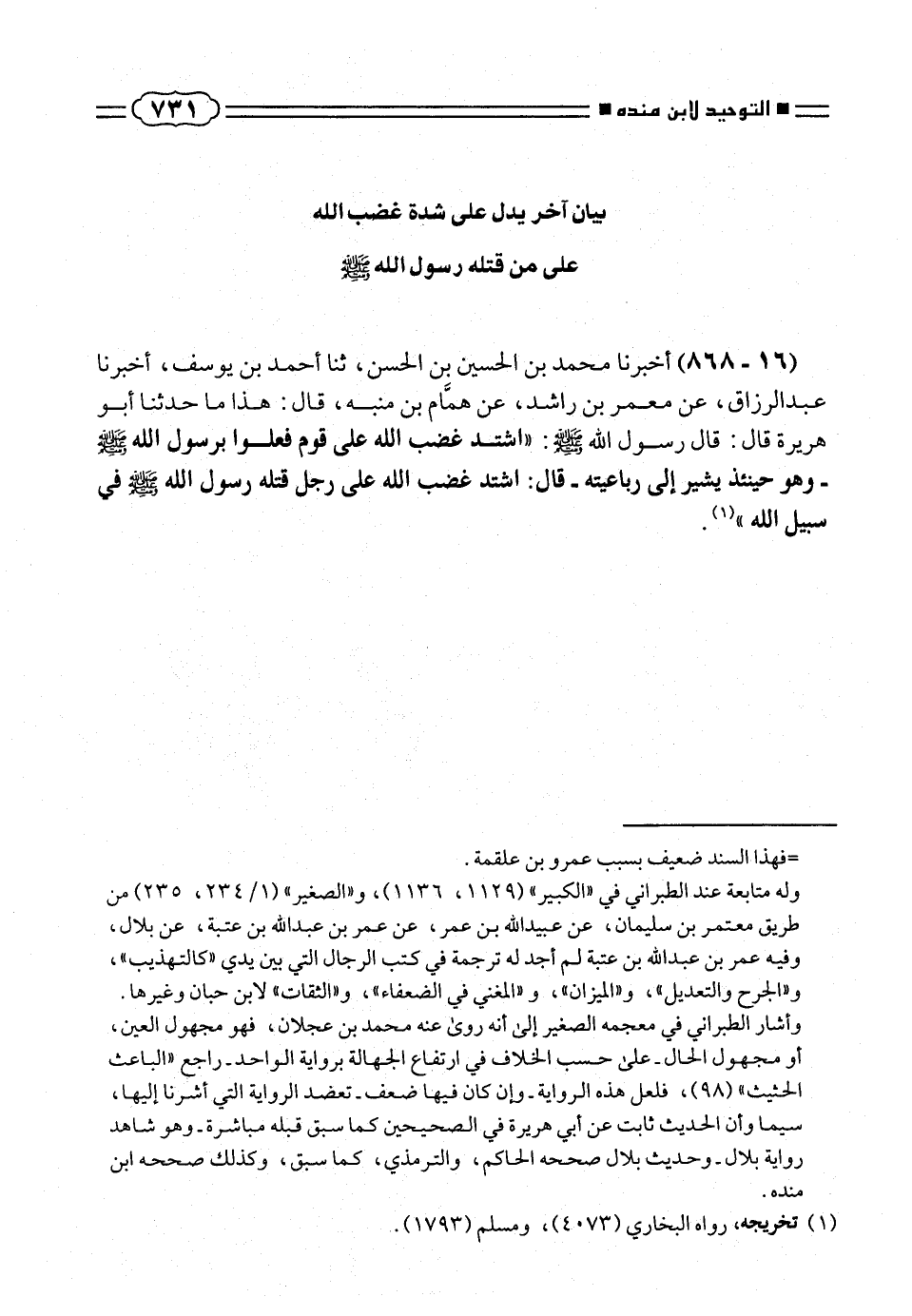 وأشار الطبرانى فى معجمه الصغير إلى أنه روى عنه محمد بن عجلان، فهو مجهول العين، أو مجهول الحال - على حسب الخلاف فى ارتفاع الجهالة برواية الواحد - راجع «الباعث الحثيث» (٩٨)، فلعل هذه الرواية - وإن كان فيها ضعف - تعضد الرواية التى أشرنا إليها، سيما وأن الحديث ثابت عن أبى هريرة فى الصحيحيين كما سبق قبله مباشرة - وهو شاهد رواية بلال - وحديث بلال صححه الحاكم، والترمذى، كما سبق، وكذلك صححه ابن منده.