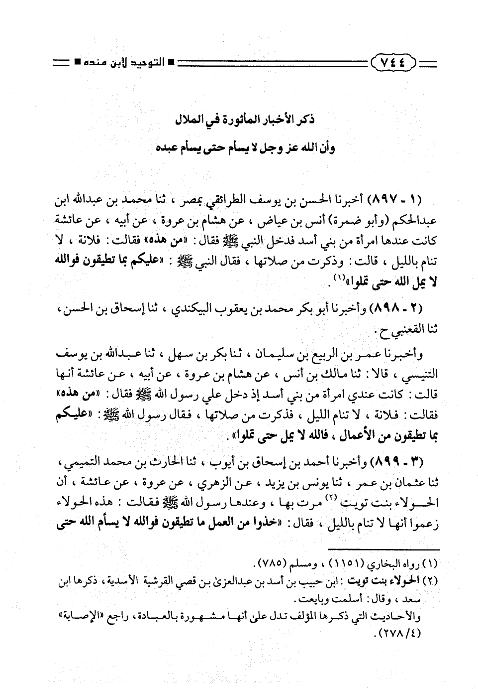 (٣ - ٨٩٩) وأخبرنا أحمد بن إسحاق بن أيوب، ثنا الحارث بن محمد التميمى، ثنا عثمان بن عمر، ثنا يونس بن يزيد، عن الزهرى، عن عروة، عن عائشة، أن الحولاء بنت تويت (¬٢) مرت بها، وعندها رسول الله صلّى الله عليه وسلم فقالت: هذه الحولاء زعموا أنها لا تنام بالليل، فقال: «خذوا من العمل ما تطيقون فوالله لا يسأم الله حتى