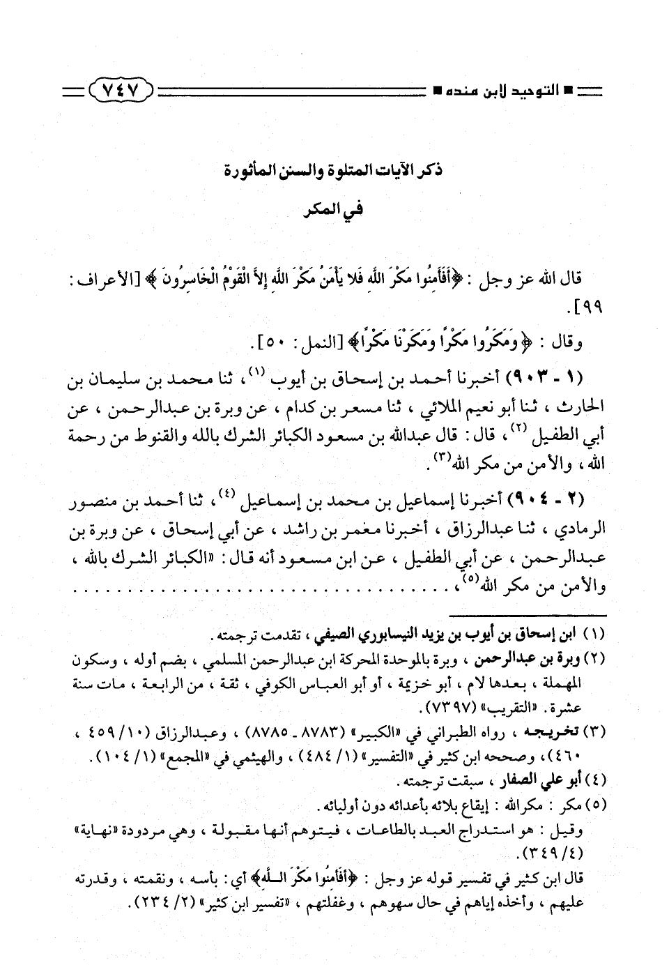 (٢ - ٩٠٤) أخبرنا إسماعيل بن محمد بن إسماعيل (¬٤)، ثنا أحمد بن منصور الرمادى، ثنا عبد الرزاق، أخبرنا معمر بن راشد، عن أبى إسحاق، عن وبرة بن عبد الرحمن، عن أبى الطفيل، عن ابن مسعود أنه قال: «الكباثر الشرك بالله، والأمن من مكر الله (¬٥)، ..