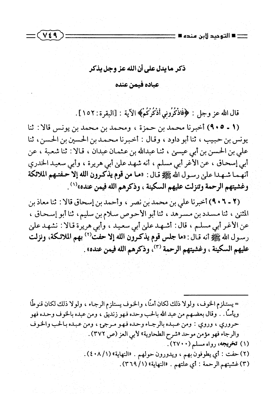(١ - ٩٠٥) أخبرنا محمد بن حمزة، ومحمد بن محمد بن يونس قالا: ثنا لِونس بن حبيب، ثنا أبو داود، وقال: أخبرنا محمد بن الحسين بن الحسن، ثنا على بن الحسن بن أبى عيسى، ثنا عبد الله بن عثمان عبدان، قالا: ثنا شعبة، عن أبى إسحاق، عن الأغر أبى مسلم، أنه شهد على أبى هريرة، وأبى سعيد الخدرى أنهما شهدا على رسول الله صلّى الله عليه وسلم قال: «ما من قوم يذكرون الله إلا حفتهم الملائكة وغشيتهم الرحمة وتنزلت عليهم السكينة، وذكرهم الله فيمن عنده» (¬١).