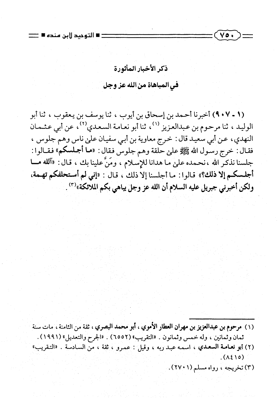 (١ - ٩٠٧) أخبرنا أحمد بن إسحاق بن أيوب، ثنا يوسف بن يعقوب، ثنا أبو الوليد، ثنا مرحوم بن عبد العزيز (¬١)، ثنا أبو نعامة السعدى (¬٢)، عن أبى عثمان النهدى، عن أبى سعيد قال خرج معاوية بن أبى سفيان على ناس وهم جلوس، فقال: خرج رسول الله صلّى الله عليه وسلم. على حلقة وهم جلوس فقال: «ما أجلسكم» فقالوا: