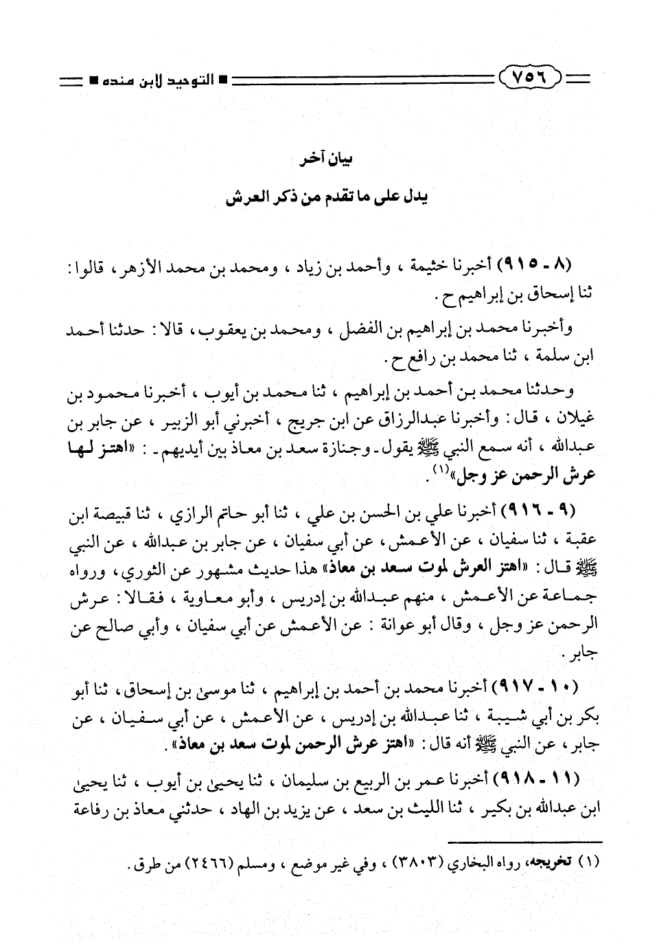 (١٠ - ٩١٧) أخبرنا محمد بن أحمد بن إبراهيم، ثنا موسى بن إسحاق، ثنا أبو بكر بن أبى شيبة، ثنا عبد الله بن إدريس، عن الأعمش، عن أبى سفيان، عن جابر، عن النبى صلّى الله عليه وسلم أنه قال: «اهتز عرش الرحمن لموت سعد بن معاذ».