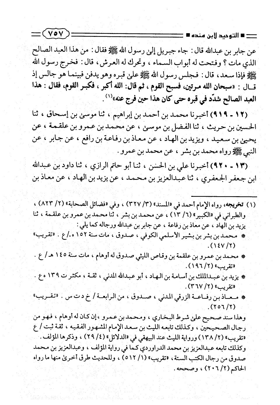 (١٢ - ٩١٩) أخبرنا محمد بن أحمد بن إبراهيم، ثنا موسى بن إسحاق، ثنا الحسين بن حريث، ثنا الفضل بن موسى، عن محمد بن عمرو بن علقمة، عن يحيى بن سعيد، ويزيد بن الهاد، عن معاذ بن رفاعة بن رافع، عن جابر، عن النبى صلّى الله عليه وسلم رواه محمد بن بشر، عن محمد بن عمرو.