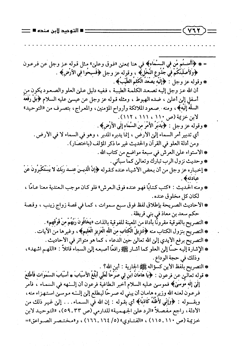 أن الله عز وجل إليه تصعد الكَلمة الطيبة، ففيه دليل على العلو والصعود يكون منِ أسفل إلى أعلى، ضده الهبوط، ومثله قوله عز وجل عن عيسى عليه السلام بَلْ رَفَعَهُ اللهُ إِلَيْهِ، ومنه صعود الملائكة وأرواح المؤمنين، والمعراج، بتصرف من «التوحيد» لابن خزيمة (ص ١١٠، ١١١، ١١٢).