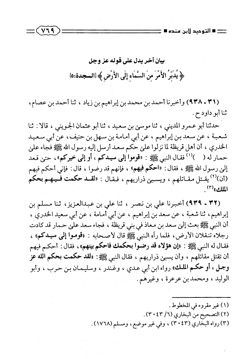 (٣٢ - ٩٣٩) أخبرنا على بن نصر، ثنا على بن عبد العزيز، ثنا مسلم بن إبراهيم، ثنا شعبة، عن سعد بن إبراهيم، عن أبى أمامة، عن أبى سعيد الخدرى، أن النبى صلّى الله عليه وسلم بعث إلى سعد بن معاذ فى بنى قريظة، فجاء سعد على حمار قد كادت رجلاه تنقلان الأرض، فلما رآه النبى صلّى الله عليه وسلم قال لأصحابه: «قوموا إلى سيدكم»)، فقال له النبى صلّى الله عليه وسلم: «إن هؤلاء قد رضوا بحكمك فاحكم بينهم»، فقال: أحكم فيهم أن تقتل مقاتلهم، وأن يسبى ذراريهم، فقال النبى صلّى الله عليه وسلم: «لقد حكمت بحكم الله عز وجل، أو حكم الملك» رواه ابن أبى عدى، وغندر، وسليمان بن حرب، وأبو الوليد، ومحمد بن عرعرة، وغيرهم.