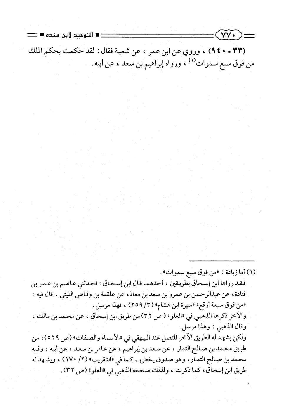 ولكن يشهد له الطريق الآخر المتصل عند البيهقى فى «الأسماء والصفات» (ص ٥٢٩)، من طريق محمد بن صالح التمار، عن سعد بن إبراهيم، عن عامر بن سعد، عن أبيه، وفيه محمد بن صالح التمار، وهو صدوق يخطئ، كما فى «التقريب» (١٧٠/ ٢)، ويشهد له طريق ابن إسحاق، كما ذكرت، ولذلك صححه الذهبى فى «العلو» (ص ٣٢).