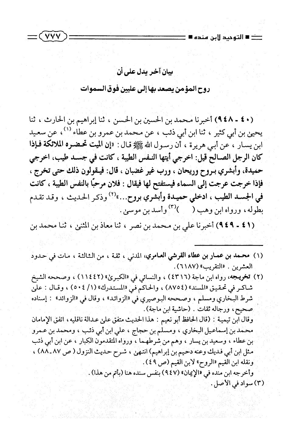 (٤٠ - ٩٤٨) أخبرنا محمد بن الحسين بن الحسن، ثنا إبراهيم بن الحارث، ثنا يحيى بن أبى كثير، ثنا ابن أبى ذئب، عن محمد بن عمرو بن عطاء (¬١)، عن سعيد ابن يسار، عن أبى هريرة، أن رسول الله صلّى الله عليه وسلم قال: «إن الميت تحضره الملائكة فإذا كان الرجل الصالح قيل: اخرجى أيتها النفس الطيبة، كانت فى جسد طيب، اخرجى حميدة، وأبشرى بروح وريحان، ورب غير غضبان، قال: فيقولون ذلك حتى تخرج، فإذا خرجت عرجت إلى السماء فيستفتح لها فيقال: فلان مرحباً بالنفس الطيبة، كانت فى الجسد الطيب، ادخلى حميدة وأبشرى بروح ... » (¬٢) وذكر الحديث، وقد تقدم بطوله، ورواه ابن وهب (. . .) (¬٣) وأسد بن موسى.