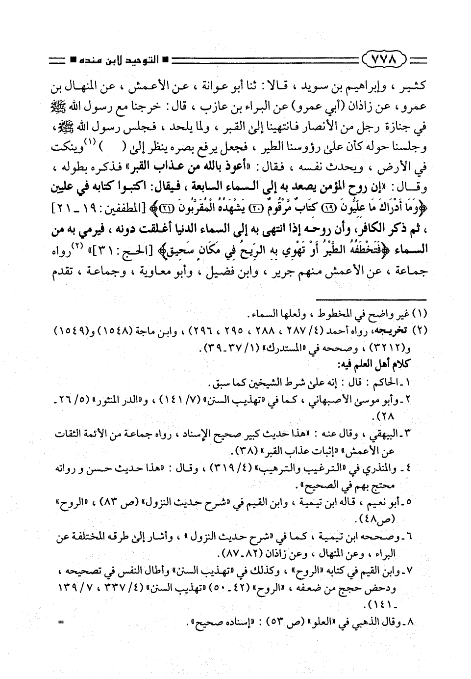 ٢ - وأبو موسى الأصبهانى، كما فى «تهذيب السنن» (١٤١/ ٧)، و «الدر المنثور» (٢٦/ ٥ - ٢٨). ٣ - البيهقى، وقال عنه: «هذا حديث كبير صحيح الاسناد، رواه جماعة من الأئمة الثقات عن الأعمش» «إثبات عذاب القبر» (٣٨). ٤ - والمنذرى فى «الترغيب والترهيب» (٣١٩/ ٤)، وقال: «هذا حديث حسن ورواته محتج بهم فى الصحيح». ٥ - أبو نعيم، قاله ابن تيمية، وابن القيم فى «شرح حديث النزول» (ص ٨٣)، «الروح» (ص ٤٨). ٦ - وصححه ابن تيمية، كما فى «شرح حديث النزول»، وأشار إلى طرقه المختلفة عن البراء، وعن المنهال، وعن زاذان (٨٢ - ٨٧). ٧ - وابن القيم فى كتابه «الروح»، وكذلك فى «تهذيب السنن» وأطال النفس فى تصحيحه، ودحض حجج من ضعفه، «الروح» (٤٢ - ٥٠) «تهذيب السنن» (٣٣٧/ ٤، ١٣٩/ ٧ - ١٤١). ٨ - وقال الذهبى فى «العلو» (ص ٥٣): «إسناده صحيح» -