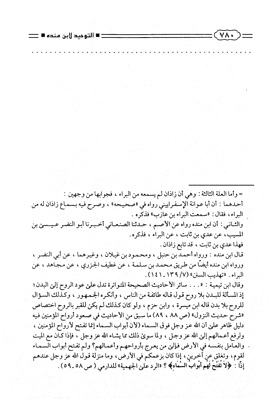 وقال ابن تيمية: « ... سائر الأحاديث الصحيحة المتواترة تدل على عود الروح إلى البدن؛ إذ المسألة للبدن بلا روح قول قاله طائفة من الناس، وأنكره الجمهور، وكذلك السؤال للروح بلا بدن قاله ابن ميسرة، وابن حزم، ولو كان كذلك لم يكن للقبر بالروح اختصاص «شرح حديث النزول» (ص ٨٨، ٨٩) ما سبق من الأحاديث فى صعود أرواح المؤمنين فيه دليل ظاهر على أن الله عز وجل فوق السماء (لأن أبواب السماء إنما تفتح لأرواح المؤمنين، ولرفع أعمالهم إلى الله عز وجل، ولما سوى ذلك مما يشاء الله عز وجل، فإذا كان مع الميت والعامل بنفسه فى الأرض فإلى من يعرج بأرواحهم وأعمالهم؟ ولم تفتح أبواب السماء لقوم، وتغلِق عن آخرين، إذا كان بزعمكم فى الأرض، وما منزلة قول الله عز وجل عندهم إذاً: لا تُفَتَّحُ لَهُمْ أَبْوابُ السَّماءِ؟ «الرد على الجهمية» للدارمى (ص ٥٨ - ٥٩).