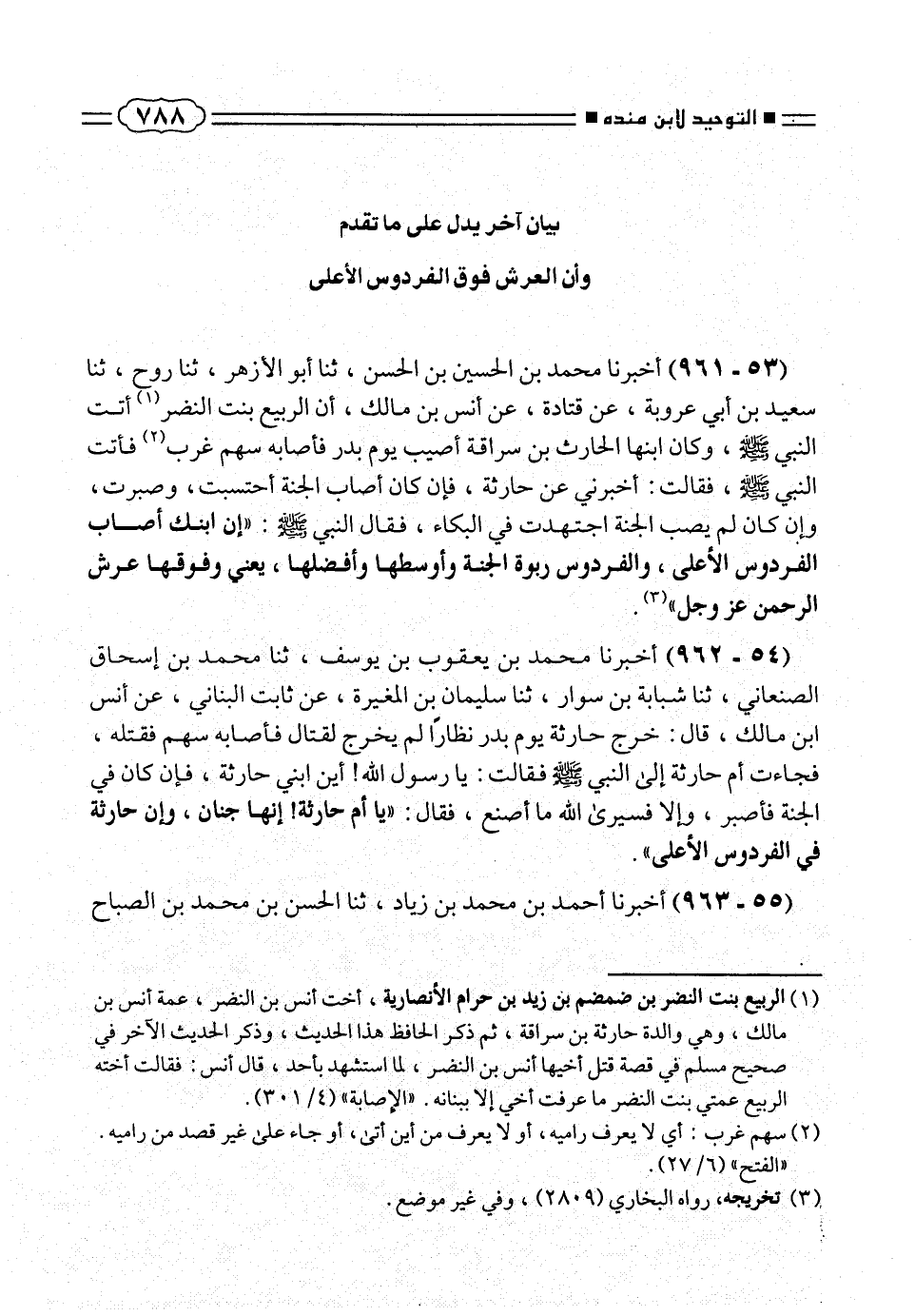 (٥٣ - ٩٦١) أخبرنا محمد بن الحسين بن الحسن، ثنا أبو الأزهر، ثنا روح، ثنا سعيد بن أبى عروبة، عن قتادة، عن أنس بن مالك، أن الربيع بنت النضر (¬١) أتت النبى صلّى الله عليه وسلم، وكان ابنها الحارث بن سراقة أصيب يوم بدر فأصابه سهم غرب (¬٢) فأتت النبى صلّى الله عليه وسلم، فقالت: أخبرنى عن حارثة، فإن كان أصاب الجنة أحتسبت، وصبرت، وإن كان لم يصب الجنة اجتهدت فى البكاء، فقال النبى صلّى الله عليه وسلم: «إن ابنك أصاب الفردوس الأعلى، والفردوس ربوة الجنة وأوسطها وأفضلها، يعنى وفوقها عرش الرحمن عز وجل» (¬٣).