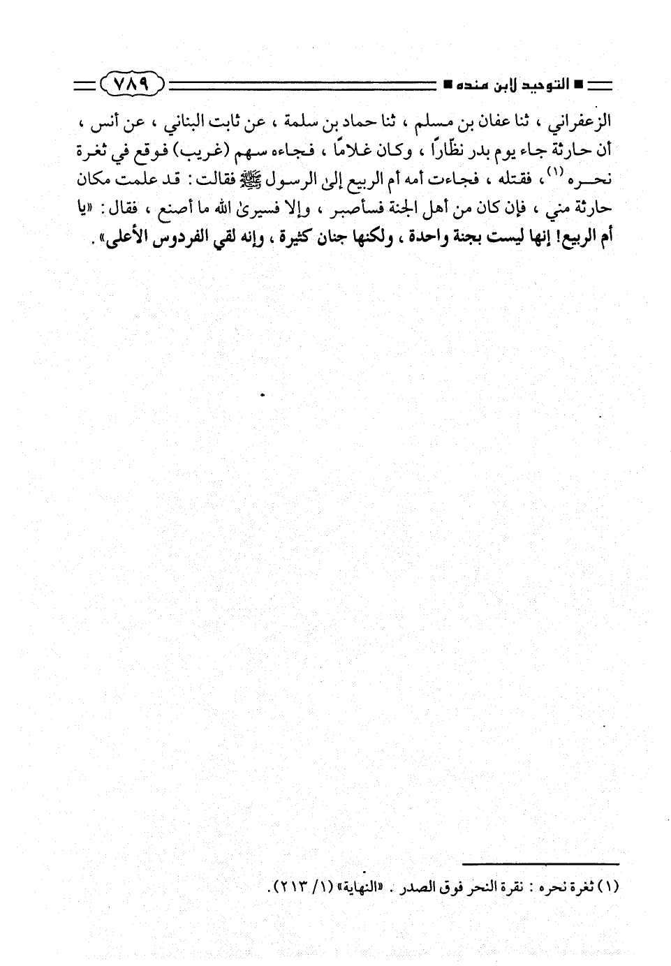 الزعفرانى، ثنا عفان بن مسلم، ثنا حماد بن سلمة، عن ثابت البنانى، عن أنس، أن حارثة جاء يوم بدر نظّارا، وكان غلاماً، فجاءه سهم (غريب) فوقع فى ثغرة نحره (¬١)، فقتله، فجأت أمه أم الربيع إلى الرسول صلّى الله عليه وسلم فقالت: قد علمت مكان حارثة منى، فإن كان من أهل الجنة فسأصبر، وإلا فسيرى الله ما أصنع، فقال: «يا أم الربيع! إنها ليست بجنة واحدة، ولكنها جنان كثيرة، وإنه لقى الفردوس الأعلى».