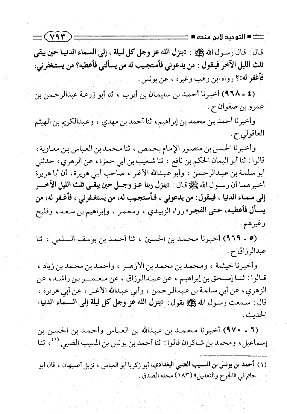 وأخبرنا الحسن بن منصور الامام بحمص، ثنا محمد بن العباس بن معاوية، قالوا: ثنا أبو اليمان الحكم بن نافع، ثنا شعيب بن أبى حمزة، عن الزهرى، حدثنى أبو سلمة بن عبد الرحمن، وأبو عبد الله الأغر، صاحب أبى هريرة، أن أبا هريرة أخبرهما أن رسول الله صلّى الله عليه وسلم قال: «ينزل ربنا عز وجل حين يبقى ثلث الليل الآخر إلى سماء الدنيا، فيقول: من يدعونى، فأستجيب له، من يستغفرنى، فأغفر له، من يسأل فأعطيه، حتى الفجر» رواه الزبيدى، ومعمر، وإبراهيم بن سعد، وفليح وغيرهم.