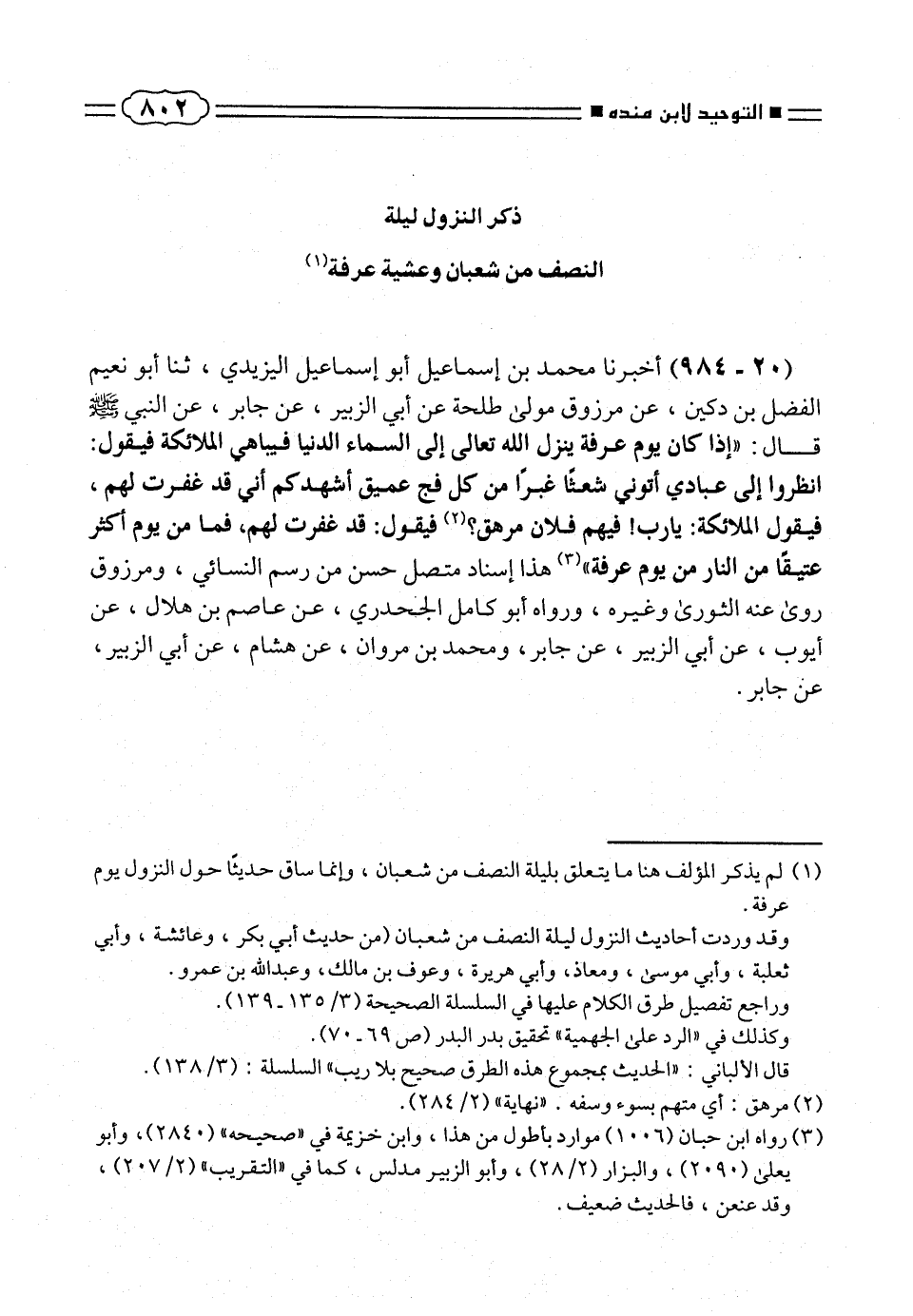 (¬١) لم يذكر المؤلف هنا ما يتعلق بليلة النصف من شعبان، وانما ساق حديثَا حول النزول يوم عرفة.