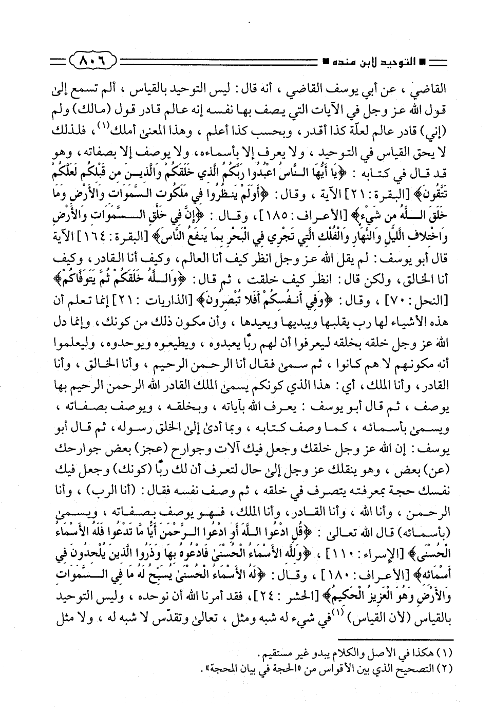 القاضى، عن أبى يوسف القاضى، أنه قال: ليس التوحيد بالقياس، ألم تسمع إلى قول الله عز وجل فى الآيات التى يصف بها نفسه إنه عالم قادر قول (مالك) ولم (إنى) قادر عالم لعلّة كذا أقدر، وبحسب كذا أعلم، وهذا المعنى أملك (¬١)، فلذلك لا يحق القياس فى التوحيد، ولا يعرف إلا بأسماءه، ولا يوصف إلا بصفاته، وهو قد قال فى كتابه: {يا أَيُّهَا النّاسُ اعْبُدُوا رَبَّكُمُ الَّذِي خَلَقَكُمْ وَالَّذِينَ مِنْ قَبْلِكُمْ لَعَلَّكُمْ تَتَّقُونَ} [البقرة: ٢١] الآية، وقال: {أَوَلَمْ يَنْظُرُوا فِي مَلَكُوتِ السَّماواتِ وَالْأَرْضِ وَما خَلَقَ اللهُ مِنْ شَيْءٍ} [الأعراف: ١٨٥]، وقال: {إِنَّ فِي خَلْقِ السَّماواتِ وَالْأَرْضِ وَاخْتِلافِ اللَّيْلِ وَالنَّهارِ وَالْفُلْكِ الَّتِي تَجْرِي فِي الْبَحْرِ بِما يَنْفَعُ النّاسَ} [البقرة: ١٦٤] الآية قالَأبو يوسف: لم يقل الله عز وجل انظر كيف أَنا العالم، وكيف أنا القادرِ، وكيف أنا الخالق، ولكن قال: انظر كيف خلقت، ثم قال: {وَاللهُ خَلَقَكُمْ ثُمَّ يَتَوَفّاكُمْ} [النحل: ٧٠]، وقال: {وَفِي أَنْفُسِكُمْ أَفَلا تُبْصِرُونَ} [الذاريات: ٢١] إنما تعلم أن هذه الأشياء لها رب يقلبها ويبديها ويعيدها، وأن مكون ذلك من كونك، وإنما دل الله عز وجل خلقه بخلقه ليعرفوا أن لهم ربا يعبدوه، ويطيعوه ويوحدوه، وليعلموا أنه مكونهم لا هم كانوا، ثم سمى فقال أنا الرحمن الرحيم، وأنا الخالق، وأنا القادر، وأنا الملك، أى: هذا الذى كونكم يسمى الملك القادر الله الرحمن الرحيم بها يوصف، ثم قال أبو يوسف: يعرف الله بآياته، وبخلقه، ويوصف بصفاته، ويسمى بأسمائه، كما وصف كتابه، وبما أدى إلى الخلق رسوله، ثم قال أبو يوسف: إن الله عز وجل خلقك وجعل فيك آلات وجوارح (عجز) بعض جوارحك (عن) بعض، وهو ينقلك عز وجل إلى حال لتعرف أن لك ربا (كونك) وجعل فيك نفسك حجة بمعرفته يتصرف فى خلقه، ثم وصف نفسه فقال: (أنا الرب)، وأنا الرحمن، وأنا الله، وأنا القادر، وأنا الملك، فهو يوصف بصفاته، ويسمى (بأسمائه) قال الله تعالى: {قُلِ ادْعُوا اللهَ أَوِ ادْعُوا الرَّحْمنَ أَيًّا ما تَدْعُوا فَلَهُ الْأَسْماءُ الْحُسْنى} [الاسراء: ١١٠]، {وَلِلّهِ الْأَسْماءُ الْحُسْنى فَادْعُوهُ بِها وَذَرُوا الَّذِينَ يُلْحِدُونَ فِي أَسْمائِهِ} [الأعراف: ١٨٠]، وقَال: {لَهُ الْأَسْماءُ الْحُسْنى يُسَبِّحُ لَهُ ما فِي السَّماواتِ وَالْأَرْضِ وَهُوَ الْعَزِيزُ الْحَكِيمُ} [الحشر: ٢٤]، فقد أمرنا الله أن نوحده، وليس التوحيد بالقياس (لأن القياس) (¬٢) فى شئ له شبه ومثل، تعالى وتقدّس لا شبه له، ولا مثل