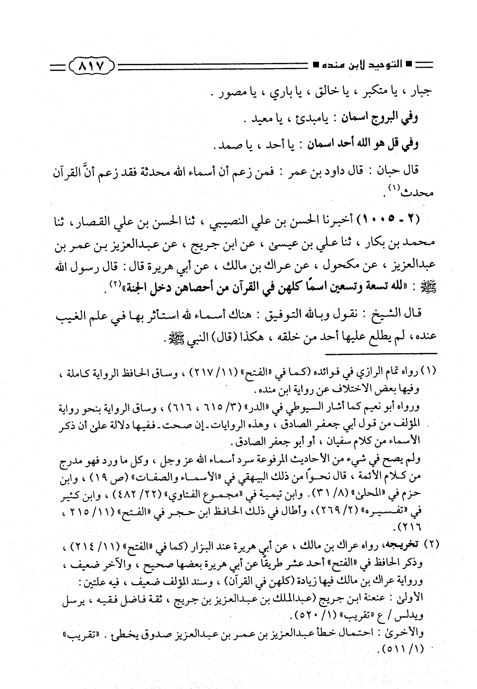 ولم يصح فى شئ من الأحاديث المرفوعة سرد أسماء الله عز وجل، وكل ما ورد فهو مدرج من كلام الأئمة، قال نحواً من ذلك البيهقى فى «الأسماء والصفات» (ص ١٩)، وابن حزم فى «المحلى» (٣١/ ٨). وابن تيمية فى «مجموع الفتاوى» (٤٨٢/ ٢٢)، وابن كثير فى ٢ تفسيره» (٢٦٩/ ٢)، وأطال فى ذلك الحافظ ابن حجر فى «الفتح» (٢١٥/ ١١، ٢١٦).