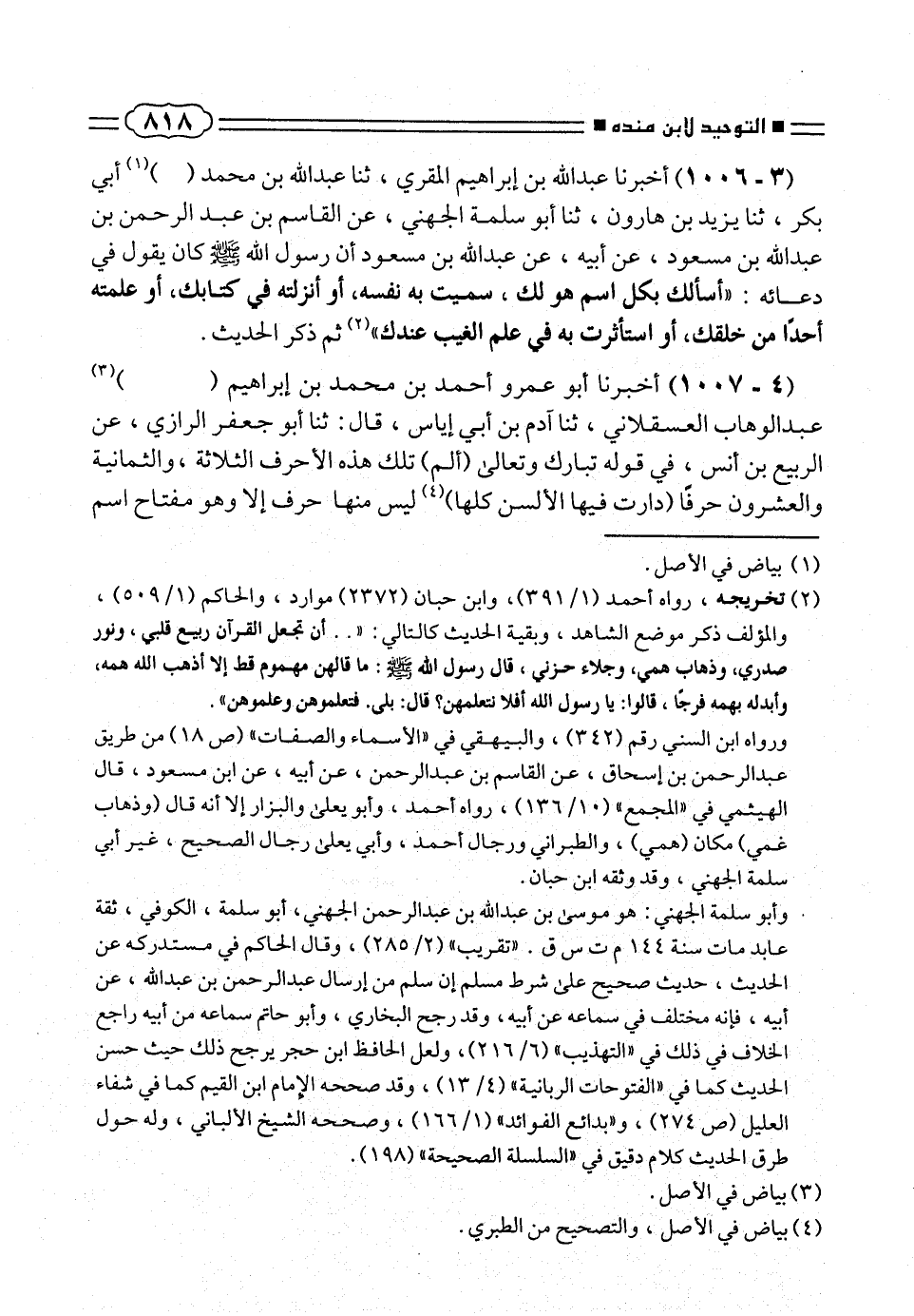 ورواه ابن السنى رقم (٣٤٢)، والبيهقى فى «الأسماء والصفات» (ص ١٨) من طريق عبد الرحمن بن إسحاق، عن القاسم بن عبد الرحمن، عن أبيه، عن ابن مسعود، قال الهيثمى فى «المجمع» (١٣٦/ ١٠)، رواه أحمد، وأبو يعلى والبزار إلا أنه قال (وذهاب غمى) مكان (همى)، والطبرانى ورجال أحمد، وأبى يعلى رجال الصحيح، غير أبى سلمة الجهنى، وقد وثقه ابن حبان.