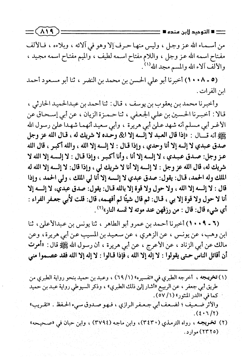 (٦ - ١٠٠٩) أخبرنا أحمد بن عمرو أبو الطاهر، ثنا يونس بن عبد الأعلى، ثنا ابن وهب، عن يونس، عن الزهرى، عن سعيد بن المسيب عن أبى هريرة، وعن مالك عن أبى الزناد، عن الأعرج، عن أبى هريرة، أن رسول الله صلّى الله عليه وسلم قال: «أمرت أن أقاتل الناس حتى يقولوا: لا إله إلا الله، فإذا قالوا: لا إله إلا الله فقد عصموا منى