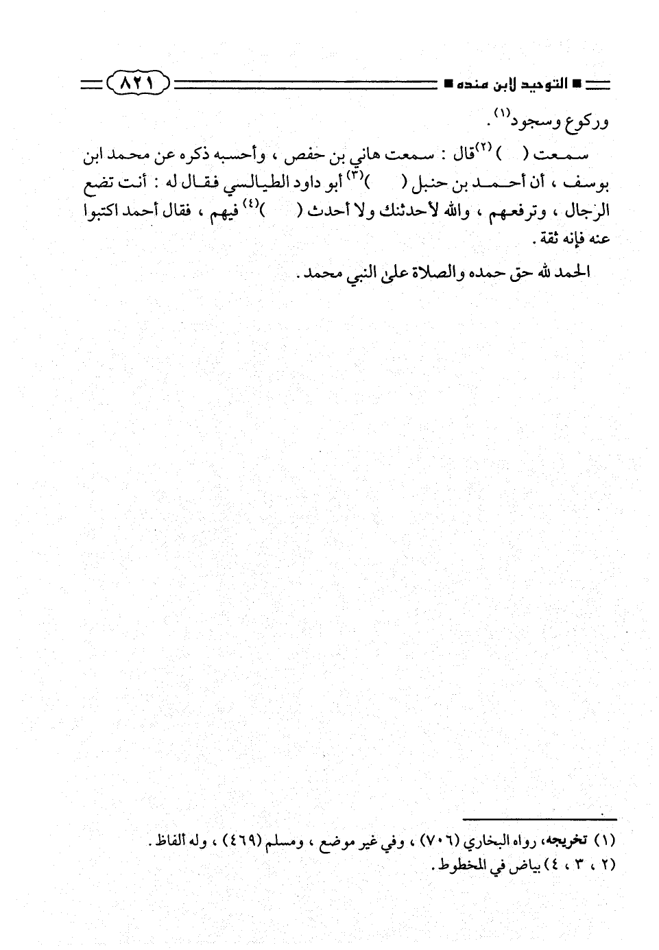 سمعت (. . .) (¬٢) قال: سمعت هانى بن حفص، وأحسبه ذكره عن محمد ابن بوسف، أن أحمد بن حنبل (. . .) (¬٣) أبو داود الطيالسى فقال له: أنت تضع الرجال، وترفعهم، والله لأحدثنك ولا أحدث (. . .) (¬٤) فيهم، فقال أحمد اكتبوا عنه فإنه ثقة.