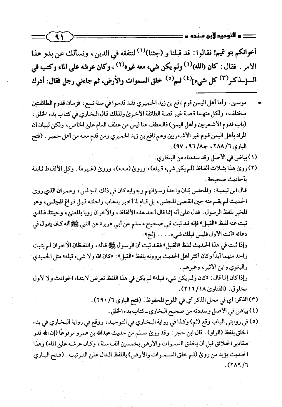 قال ابن تيمية: والمجلس كان واحداً وسؤالهم وجوابه كان فى ذلك المجلس، وعمران الذى روى الحديث لم يقم منه حين انقضى المجلس، بل قام لما أخبر بذهاب راحلته قبل فراغ المجلس، وهو المخبر بلفظ الرسول. فدل على أنه إنما قال أحد هذه الألفاظ، والآخران رويا بالمعنى، وحينئذ فالذى ثبت عنه لفظ «القبل» فإنه قد ثبت فى صحيح مسلم عن أبى هريرة عن النبى صلّى الله عليه وسلم أنه كان يقول فى دعائه «أنت الأول فليس قبلك شئ .... إلخ».
