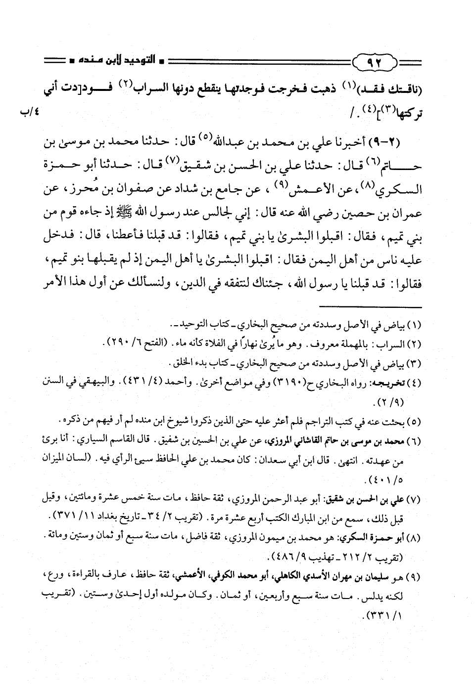 (ناقتك فقد) (¬١) ذهبت فخرجت فوجدتها ينقطع دونها السراب (¬٢) فود [دت أنى تركتها (¬٤) [(¬٣). / (٢ - ٩) أخبرنا على بن محمد بن عبد الله (¬٥) قال: حدثنا محمد بن موسى بن حاتم (¬٦) قال: حدثنا على بن الحسن بن شقيق (¬٧) قال: حدثنا إبو حمزة السكرى (¬٨)، عن الأعمش (¬٩)، عن جامع بن شداد عن صفوان بن مُحرز، عن عمران بن حصين رضى الله عنه قال: إنى لجالس عند رسول الله صلّى الله عليه وسلم إذ جاءه قوم من بنى تميم، فقال: اقبلوا البشرى يا بنى تميم، فقالوا: قد قبلنا فأعطنا، قال: فدخل عليه ناس من أهل اليمن فقال: اقبلوا البشرى يا أهل اليمن إذ لم يقبلها بنو تميم، فقالوا: قد قبلنا يا رسول الله، جئناك لنتفقه فى الدين، ولنسألك عن أول هذا الأمر
