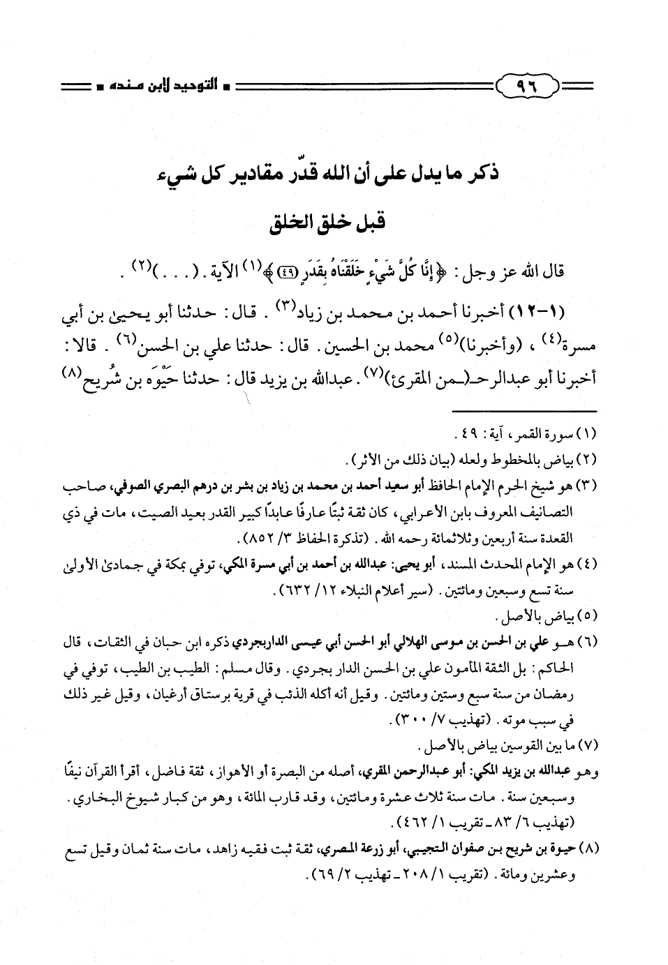 قال الله عز وجل: {إِنّا كُلَّ شَيْءٍ خَلَقْناهُ بِقَدَرٍ (٤٩)} (¬١) الآية. ( ... ) (¬٢).