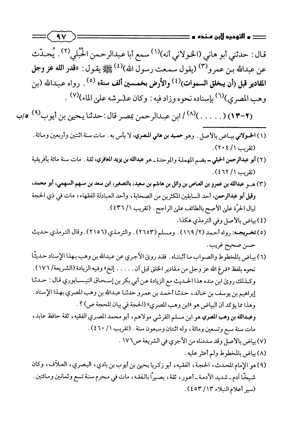 قال: حدثنى أبو هانى (الخولانى أنه) (¬١) سمع أبا عبد الرحمن الحُبُلى (¬٢). يحدّث عن عبد الله بن عمرو (¬٣) (يقول سمعت رسول الله) (¬٤) صلّى الله عليه وسلم يقول: «قدر الله عز وجل المقادير قبل (أن يخلق السموات) (¬٤) والأرض بخمسين ألف سنة» (¬٥). رواه عبد الله (بن وهب المصرى) (¬٦) بإسناده نحوه وزاد فيه: وكان ع (رشه على الماء) (¬٧).