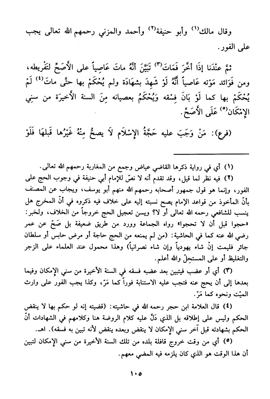 (¬2) فيه نظر لما قيل، وقد تقدم أنه لا نص للإمام أبي حنيفة في وجوب الحج على الفور، وإنما هو قول جمهور أصحابه رحمهم الله منهم أبو يوسف، ويجاب عن المصنف بأن المأخوذ من قواعد الإمام يصح نسبته إليه على خلاف فيه ذكروه في أن المخرج هل ينسب للشافعي رحمه الله تعالى أو لا؟ ويسن تعجيل الحج خروجاً من الخلاف، ولخبر: "حجوا قبل أن لا تحجوا" رواه الجماعة وورد من طريق ضعيفة بل صَح عن عمر رضي الله عنه كما في الحاشية: (من لم يمنعه من الحج حاجة أو مرض حابس أو سلطان جائر فليمت إن شاء يهودياً وإن شاء نصرانياً) وهذا محمول عند العلماء على الزجر والتغليظ أو على المستحِلّ والله أعلم.