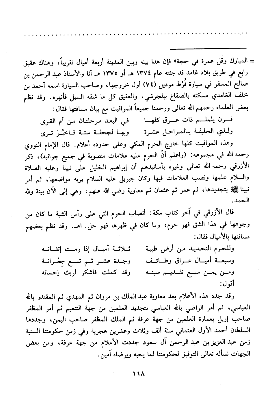 = المبارك وقل عمرة في حجة" فإن هذا بينه وبين المدينة أربعة أميال تقريباً، وهناك عقيق رابع في طريق بلاد غامد قد جئته عام 1374 هـ أو 1375 هـ أنا والأستاذ عبد الرحمن بن صالح المسفر في سيارة فُرْط موديل (74) أول خروجها، وصاحب السيارة اسمه أحمد بن خلف الغامدي مسكنه بالصقاع ببلجرشي، والعقيق كل ما شقه السيل فأنهره. وقد نظم بعض العلماء رحمهم الله تعالى ورحمنا جميعاً المواقيت مع بيان مسافتها فقال: