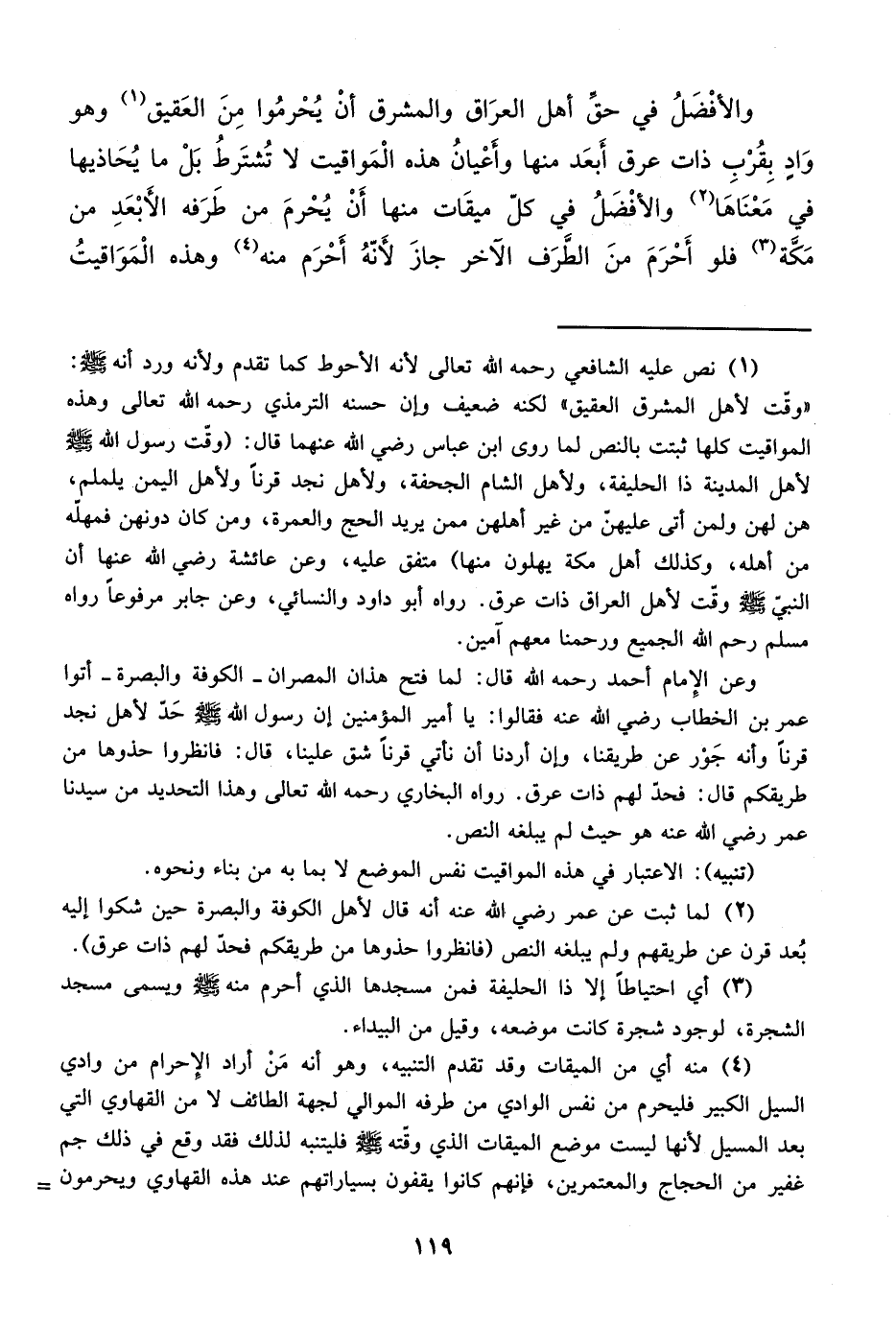 والأفْضَلُ في حقِّ أهل العرَاق والمشرق أنْ يُحْرمُوا مِنَ العَقيق (¬1) وهو وَادٍ بِقُرْبِ ذات عرق أَبعَد منها وأَعْيانُ هذه الْمَواقيت لا تُشتَرطُ بَلْ ما يُحَاذيها في مَعْنَاهَا (¬2) والأفْضَلُ في كلّ ميقَات منها أنْ يُحْرمَ من طَرَفه الأَبْعَدِ من مَكَّة (¬3) فلو أَحْرَمَ منَ الطَّرَف الآخر جازَ لأَنهُ أَحْرَم منه (¬4) وهذه الْمَوَاقيتُ