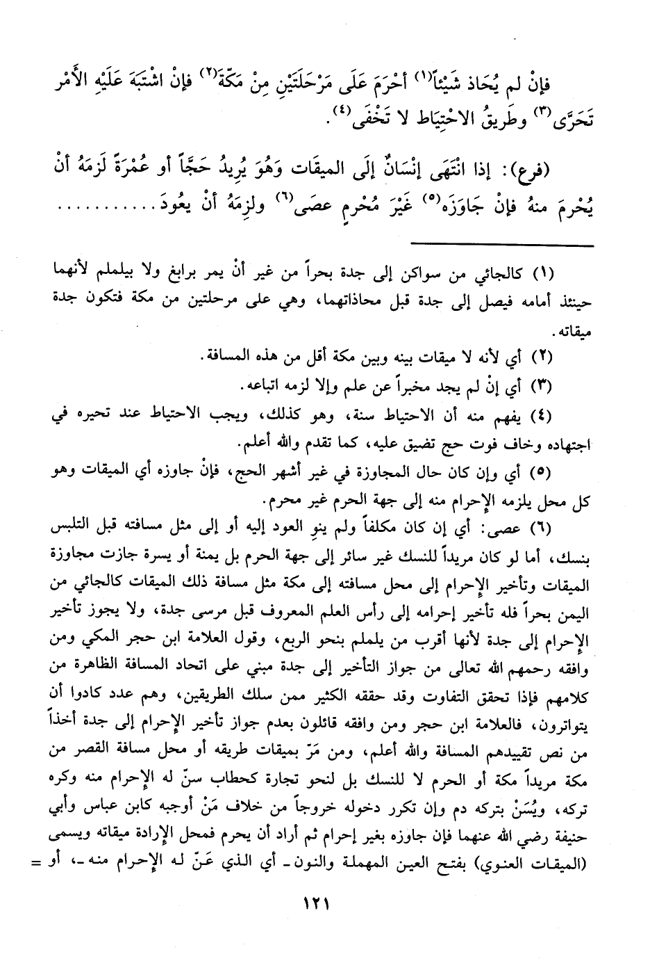 (¬1) كالجائي من سواكن إلى جدة بحراً من غير أنْ يمر برابغ ولا بيلملم لأنهما حينئذ أمامه فيصل إلى جدة قبل محاذاتهما، وهي على مرحلتين من مكة فتكون جدة ميقاته.