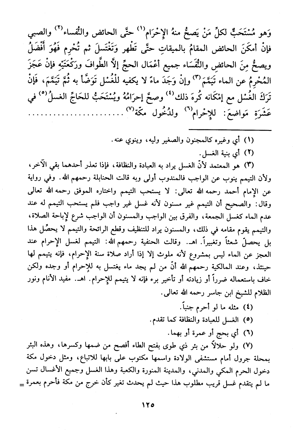 وَهو مُسْتَحَب لكل مَنْ يَصح منهُ الإِحْرَام (¬1) حتى الحائض والنُّفساء (¬2) والصبي فإنْ أمكَنَ الحائض المقامُ بالميقاتِ حتَّى تَطْهر وَتَغْتَسلَ ثم تُحْرِم فَهُوَ أَفْضَلُ ويصحُّ مِنَ الحائضِ والنُّفَسَاء جميع أعْمَال الحج إلاَّ الطَّوافَ ورَكْعَتَيْهِ فإنْ عَجَزَ المُحْرِمُ عن الماء تَيَمَّمَ (¬3) وإنْ وَجَدَ ماءً لا يكفيه للْغُسْل تَوَضَّأ به ثُمَّ تَيَممَ، فَإنْ تَرَكَ الغُسْل مع إمْكَانه كُرهَ ذلك (¬4) وصح إحرَامُهُ ويُسْتَحَبُّ للحَاج الغسلُ (¬5) في عَشَرَةِ مَواضعَ: للإحْرام (¬6) ولدُخُول مكّة (¬7)