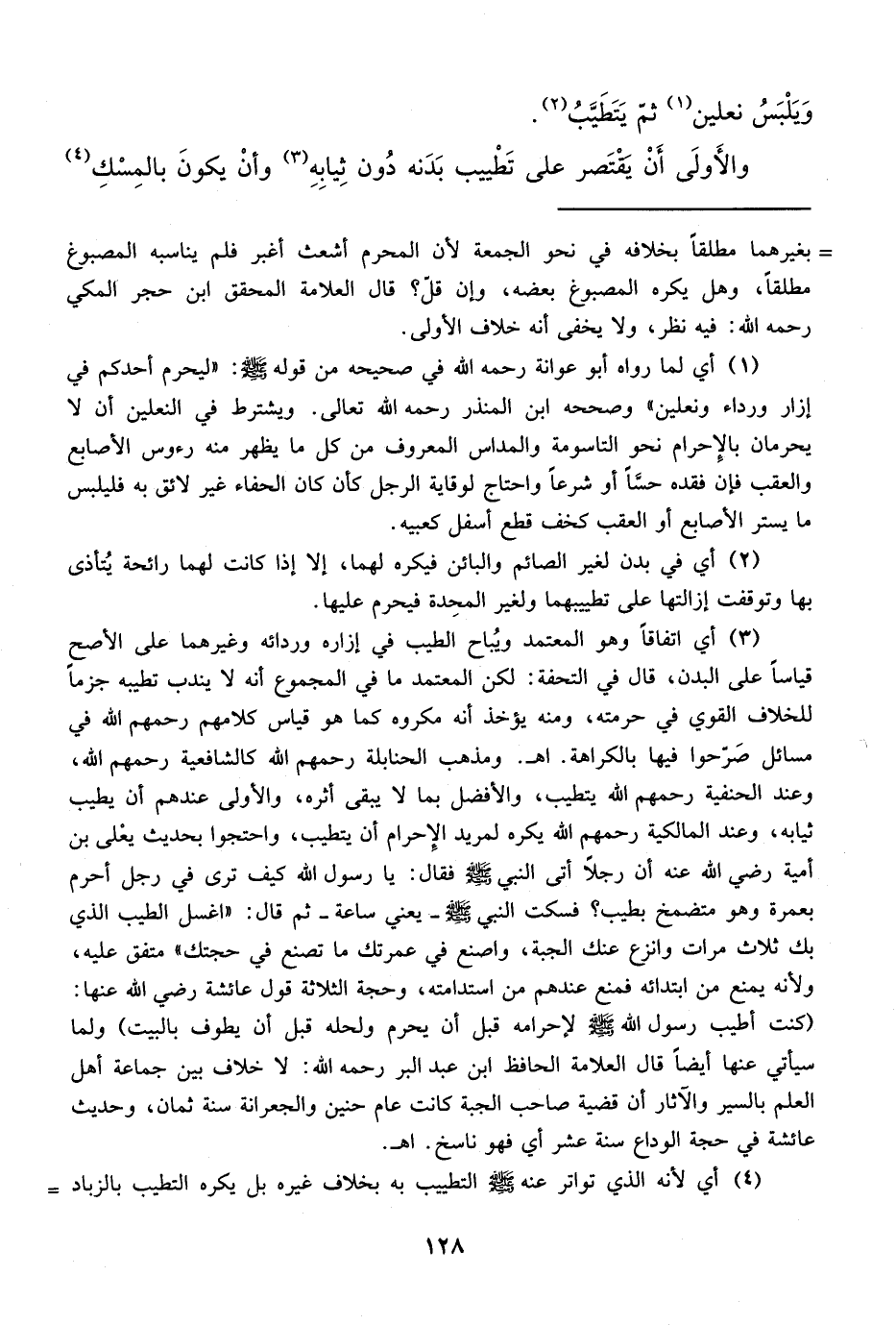(¬3) أي اتفاقاً وهو المعتمد ويُباح الطيب في إزاره وردائه وغيرهما على الأصح قياساً على البدن، قال في التحفة: لكن المعتمد ما في المجموع أنه لا يندب تطيبه جزماً للخلاف القوي في حرمته، ومنه يؤخذ أنه مكروه كما هو قياس كلامهم رحمهم الله في مسائل صَرّحوا فيها بالكراهة. اهـ. ومذهب الحنابلة رحمهم الله كالشافعية رحمهم الله، وعند الحنفية رحمهم الله يتطيب، والأفضل بما لا يبقى أثره، والأولى عندهم أن يطيب ثيابه، وعند المالكية رحمهم الله يكره لمريد الإِحرام أن يتطيب، واحتجوا بحديث يعْلى بن أمية رضي الله عنه أن رجلاً أتى النبي - صلى الله عليه وسلم - فقال: يا رسول الله كيف ترى في رجل أحرم بعمرة وهو متضمخ بطيب؟ فسكت النبي - صلى الله عليه وسلم -يعني ساعة- ثم قال: "اغسل الطيب الذي بك ثلاث مرات وانزع عنك الجبة، واصنع في عمرتك ما تصنع في حجتك" متفق عليه، ولأنه يمنع من ابتدائه فمنع عندهم من استدامته، وحجة الثلاثة قول عائشة رضي الله عنها: (كنت أطيب رسول الله - صلى الله عليه وسلم - لإحرامه قبل أن يحرم ولحله قبل أن يطوف بالبيت) ولما سيأتي عنها أيضاً قال العلامة الحافظ ابن عبد البر رحمه الله: لا خلاف بين جماعة أهل العلم بالسير والآثار أن قضية صاحب الجبة كانت عام حنين والجعرانة سنة ثمان، وحديث عائشة في حجة الوداع سنة عشر أي فهو ناسخ. اهـ.
