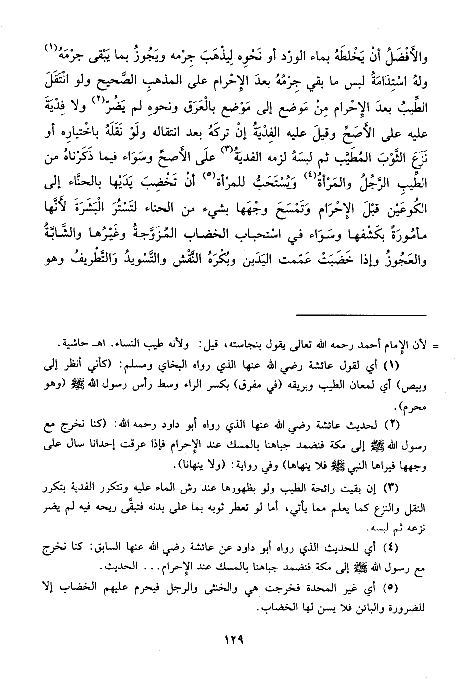 والأَفْضَلُ أنْ يَخْلطَهُ بماء الورْد أو نَحْوِه لِيذْهَبَ جِرْمه ويَجُوزُ بما يَبْقى جرْمَهُ (¬1) ولهُ اسْتِدَامَةُ لبس ما بقي جِرْمُهُ بعدَ الإِحْرام على المذهبِ الصَحيح ولو انْتَقَلَ الطِّيبُ بعدَ الإحْرام مِنْ مَوضع إلى مَوْضع بالْعَرَق ونحوهِ لم يَضُرّ (¬2) ولا فِدْيةَ عليه على الأَصَحِّ وقيلَ عليه الفِدْيةُ إنْ تركَهُ بعد انتقاله ولَوْ نَقَلَهُ باخْتيارِه أو نَزَعَ الثَّوْبَ المُطَيب ثم لبسَهُ لزمه الفديةُ (¬3) علَى الأَصحِّ وسَوَاء فيما ذَكَرْناهُ من الطِّيبِ الرَّجُلُ والمَرْأةُ (¬4) وَيُسْتَحَب للمرْأة (¬5) أنْ تَخْضِبَ يَدَيْها بالحنَّاء إلى الكُوعَيْن قبْلَ الإحْرَام وَتَمْسَحَ وجْهَها بشيء من الحناء لتَسْتُرَ الْبَشَرَةَ لأَنَّها مأمُورَة بكَشْفها وسَوَاء في اسْتحباب الخضاب المُزَوَّجةُ وغَيْرُها والشابَّةُ والعَجُوزُ وإذا خَضَبَتْ عَممت اليَدَين ويُكْرَهُ النَّقْش والتَّسْويدُ وَالتطْريفُ وهو