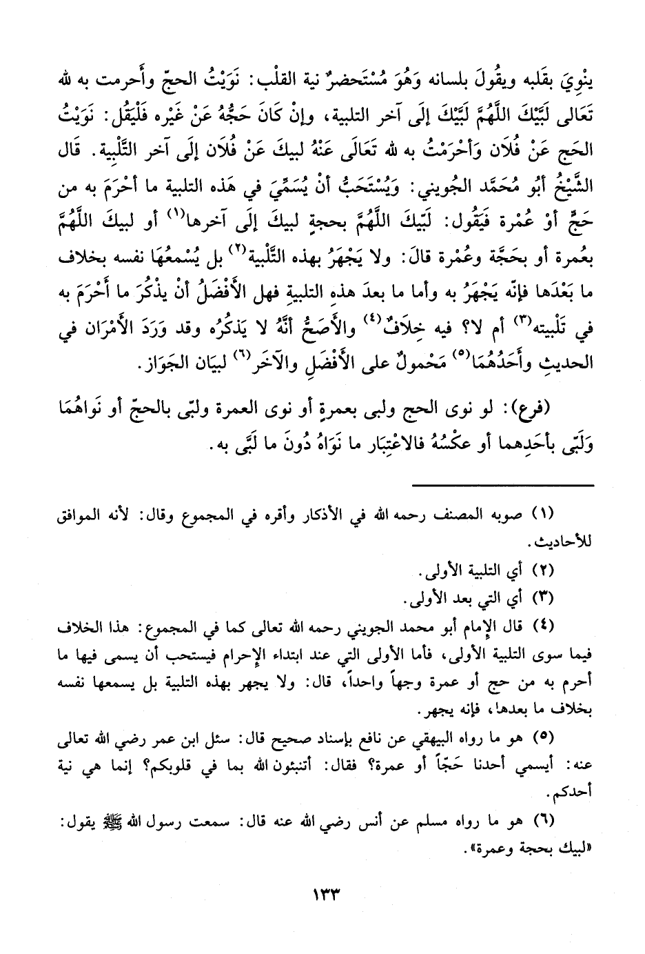 (¬4) قال الإِمام أبو محمد الجويني رحمه الله تعالى كما في المجموع: هذا الخلاف فيما سوى التلبية الأولى، فأما الأولى التي عند ابتداء الإِحرام فيستحب أن يسمى فيها ما أحرم به من حج أو عمرة وجهاً واحداً، قال: ولا يجهر بهذه التلبية بل يسمعها نفسه بخلاف ما بعدها، فإنه يجهر.