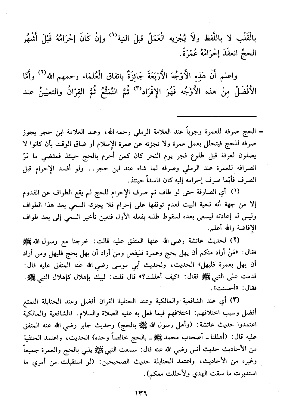 (¬3) أي عند الشافعية والمالكية وعند الحنفية القران أفضل وعند الحنابلة التمتع أفضل وسبب اختلافهم: اختلافهم فيما فعل به عليه الصلاة والسلام. فالشافعية والمالكية اعتمدوا حديث عائشة: (وأهل رسول الله - صلى الله عليه وسلم - بالحج) وحديث جابر رضي الله عنه المتفق عليه قال: (أهللنا -أصحاب محمد صلى الله عليه وسلم- بالحج خالصاً وحده) الحديث، واعتمد الحنفية من الأحاديث حديث أنس رضي الله عنه قال: سمعت النبي - صلى الله عليه وسلم - يلبي بالحج والعمرة جميعاً وغيره من الأحاديث، واعتمد الحنابلة حديث الصحيحين: (لو استقبلت من أمري ما استدبرت ما سقت الهدي ولأحللت معكم).