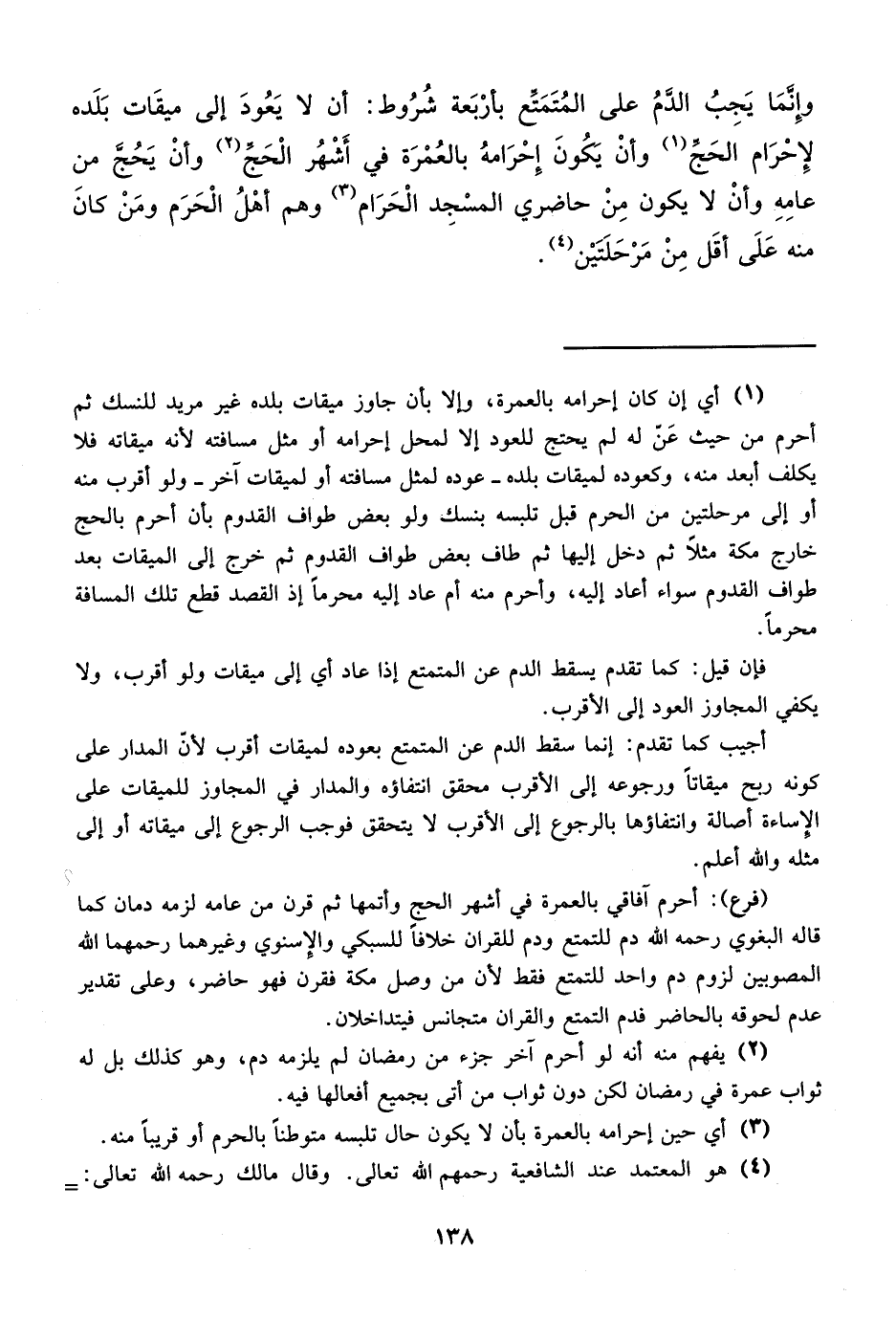 وإِنَّمَا يَجِبُ الدَّمُ على المُتَمَتع بأرْبَعة شُرُوط: أن لا يَعُودَ إلى ميقَات بَلَده لإحْرَام الحَج (¬1) وأنْ يكُونَ إِحْرَامهُ بالعُمْرَة في أشْهُر الْحَج (¬2) وأنْ يَحُجَّ من عامِهِ وأنْ لا يكون مِنْ حاضري المسْجِد الْحَرَام (¬3) وهم أهْلُ الْحَرَم ومَنْ كانَ منه عَلَى أقَل مِنْ مَرْحَلَتَيْن (¬4).