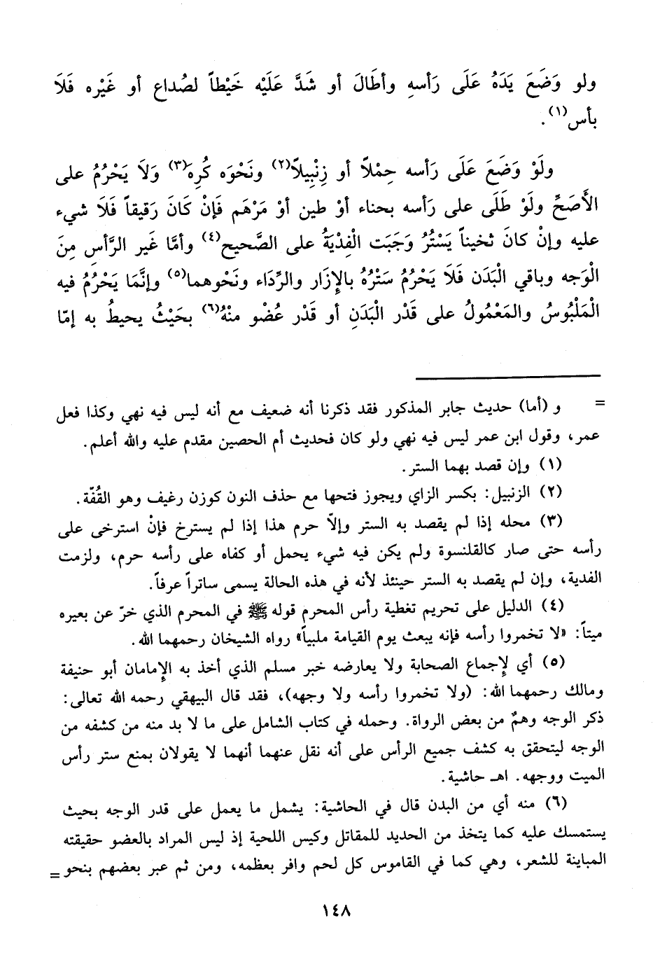 (¬4) الدليل على تحريم تغطية رأس المحرم قوله - صلى الله عليه وسلم - في المحرم الذي خر عن بعيره ميتاً: "لا تخمروا رأسه فإنه يبعث يوم القيامة ملبياً" رواه الشيخان رحمهما الله.