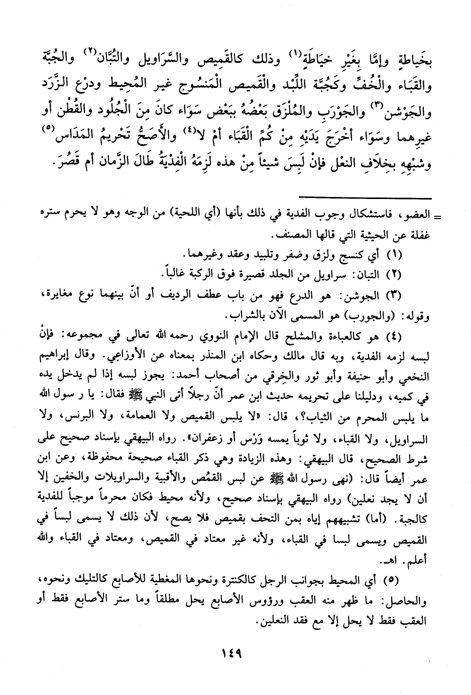 (¬4) هو كالعباءة والمشلح قال الإمام النووي رحمه الله تعالى في مجموعه: فإنْ لبسه لزمه الفدية، وبه قال مالك وحكاه ابن المنذر بمعناه عن الأوزاعي. وقال إبراهيم النخعي وأبو حنيفة وأبو ثور والخِرقي من أصحاب أحمد: يجوز لبسه إذا لم يدخل يده في كميه، ودليلنا على تحريمه حديث ابن عمر أن رجلاً أتى النبي - صلى الله عليه وسلم - فقال: يا رسول الله ما يلبس المحرم من الثياب؟، قال: "لا يلبس القميص ولا العمامة، ولا البرنس، ولا السراويل، ولا القباء، ولا ثوباً يمسه وَرْس أو زعفران". رواه البيهقي بإسناد صحيح على شرط الصحيح، قال البيهقي: وهذه الزيادة وهي ذكر القباء صحيحة محفوظة، وعن ابن عمر أيضاً قال: (نهى رسول الله - صلى الله عليه وسلم - عن لبس القمُص والأقبية والسراويلات والخفين إلا أن لا يجد نعلين) رواه البيهقي بإسناد صحيح، ولأنه محيط فكان محرماً موجباً للفدية كالجبة. (أما) تشبيههم إياه بمن التحف بقميص فلا يصح، لأن ذلك لا يسمى لبساً في القميص ويسمى لبسا في القباء، ولأنه غير معتاد في القميص، ومعتاد في القباء والله أعلم. اهـ.