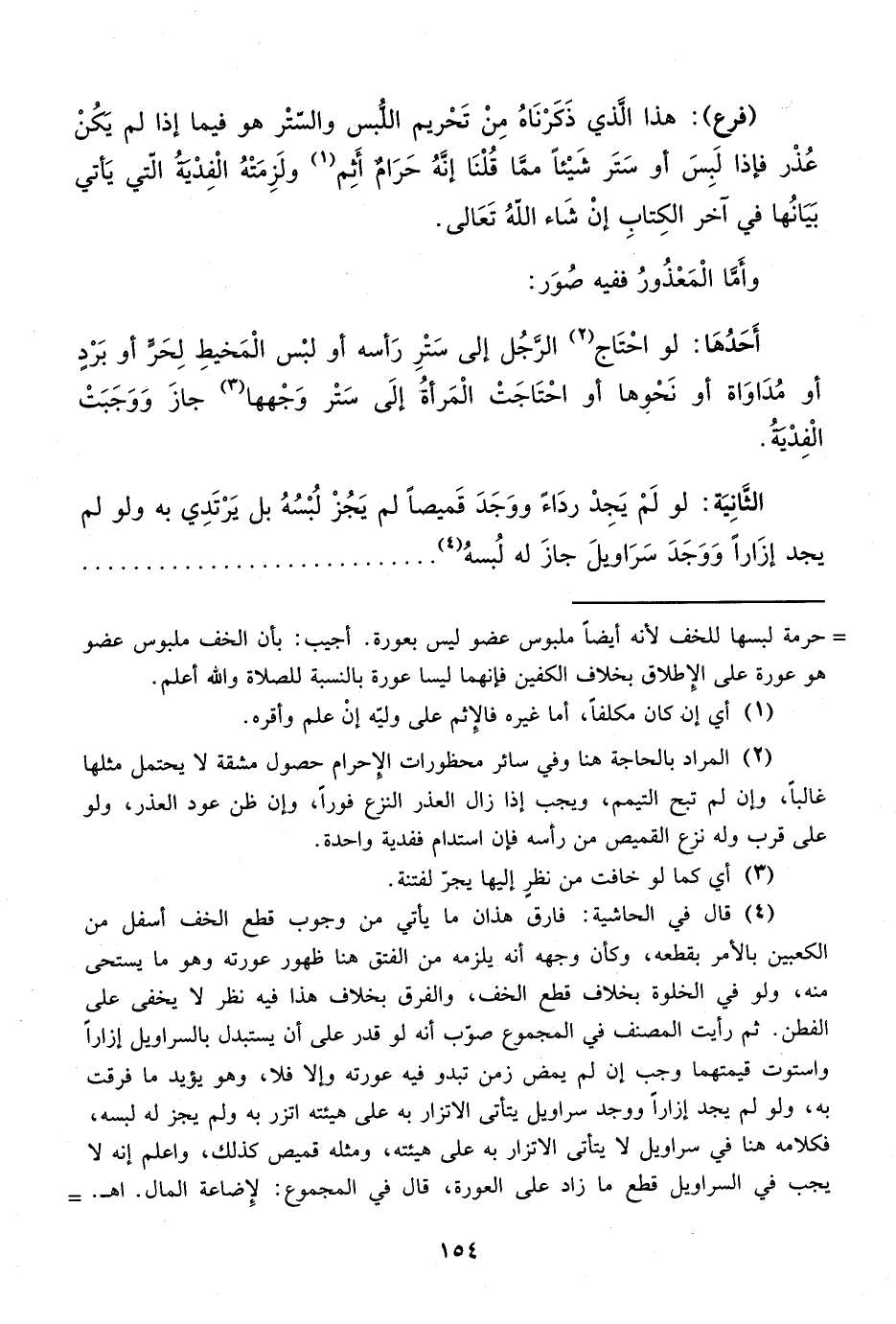 (¬4) قال في الحاشية: فارق هذان ما يأتي من وجوب قطع الخف أسفل من الكعبين بالأمر بقطعه، وكأن وجهه أنه يلزمه من الفتق هنا ظهور عورته وهو ما يستحى منه، ولو في الخلوة بخلاف قطع الخف، والفرق بخلاف هذا فيه نظر لا يخفى على الفطن. ثم رأيت المصنف في المجموع صوّب أنه لو قدر على أن يستبدل بالسراويل إزاراً واستوت قيمتهما وجب إن لم يمض زمن تبدو فيه عورته وإلا فلا، وهو يؤيد ما فرقت به، ولو لم يجد إزاراً ووجد سراويل يتأتى الاتزار به على هيئته اتزر به ولم يجز له لبسه، فكلامه هنا في سراويل لا يتأتى الاتزار به على هيئته، ومثله قميص كذلك، واعلم إنه لا يجب في السراويل قطع ما زاد على العورة، قال في المجموع: لإضاعة المال. اهـ. =