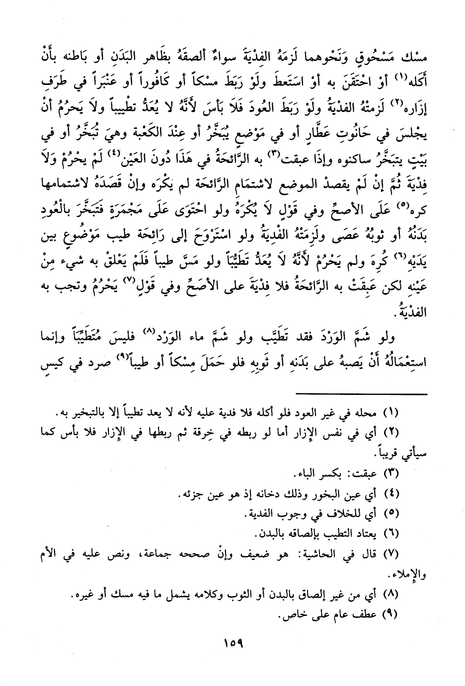 مسْك مَسْحُوق وَنَحْوهما لَزمَهُ الفِدْيةَ سواءٌ ألصقَهُ بظَاهر البَدَنِ أو بَاطنه بأَنْ أَكَله (¬1) أوْ احْتَقَنَ به أوْ اسَتَعطَ ولَوْ رَبَطَ مسْكاً أو كَافُوراً أو عَنْبَراً في طَرَفِ إزَاره (¬2) لَزمتْهُ الفدْيةُ ولَوْ رَبَطَ العُودَ فَلاَ بَأسَ لأَنَّهُ لا يُعَدُّ تطْييباً ولاَ يَحرُمُ أنْ يجْلسَ في حَانُوتِ عَطَّارٍ أو في مَوْضع يُبَخَّرُ أو عِنْدَ الكَعْبة وهيَ تُبَخرُ أو في بَيْت يتبَخَّرُ ساكنوه وإذَا عبقت (¬3) به الرَّائحَةُ في هَذَا دُونَ العَيْن (¬4) لَمْ يحْرُمْ وَلاَ فِدْيةَ ثُم إنْ لَمْ يقصدْ الموضع لاشتمَامِ الرَّائحَة لم يكْرَه وإنْ قَصَدَهُ لاشتمامها كره (¬5) عَلَى الأصحِّ وفي قَوْلٍ لاَ يُكْرَهُ ولو احْتَوَى عَلَى مَجْمَرَة فتبخرَ بالْعُودِ بَدَنُهُ أو ثوبُهُ عَصَى ولَزِمَتْهُ الفْدِيةُ ولو اسْتَرْوَحَ إلى رَائِحَة طيب مَوْضُوع بين يَدَيْهِ (¬6) كُرِهَ ولم يَحْرُمْ لأَنَّهُ لاَ يُعَدُّ تَطَيبَاً ولو مَسَّ طيباً فَلَمْ يَعْلقْ به شيء مِنْ عَيْنهِ لكن عَبِقَتْ به الرَائحَةُ فلا فِدْيةَ على الأصَحِّ وفي قَوْلٍ (¬7) يَحْرُمُ وتجب به الفدْية.