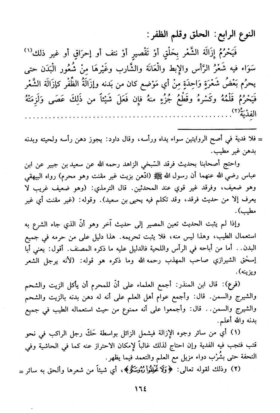 (¬2) وذلك لقوله تعالى: {وَلَا تَحْلِقُوا رُءُوسَكُمْ} [البقرة: 196]، أي شيئاً من شعرها وألحق به سائر =