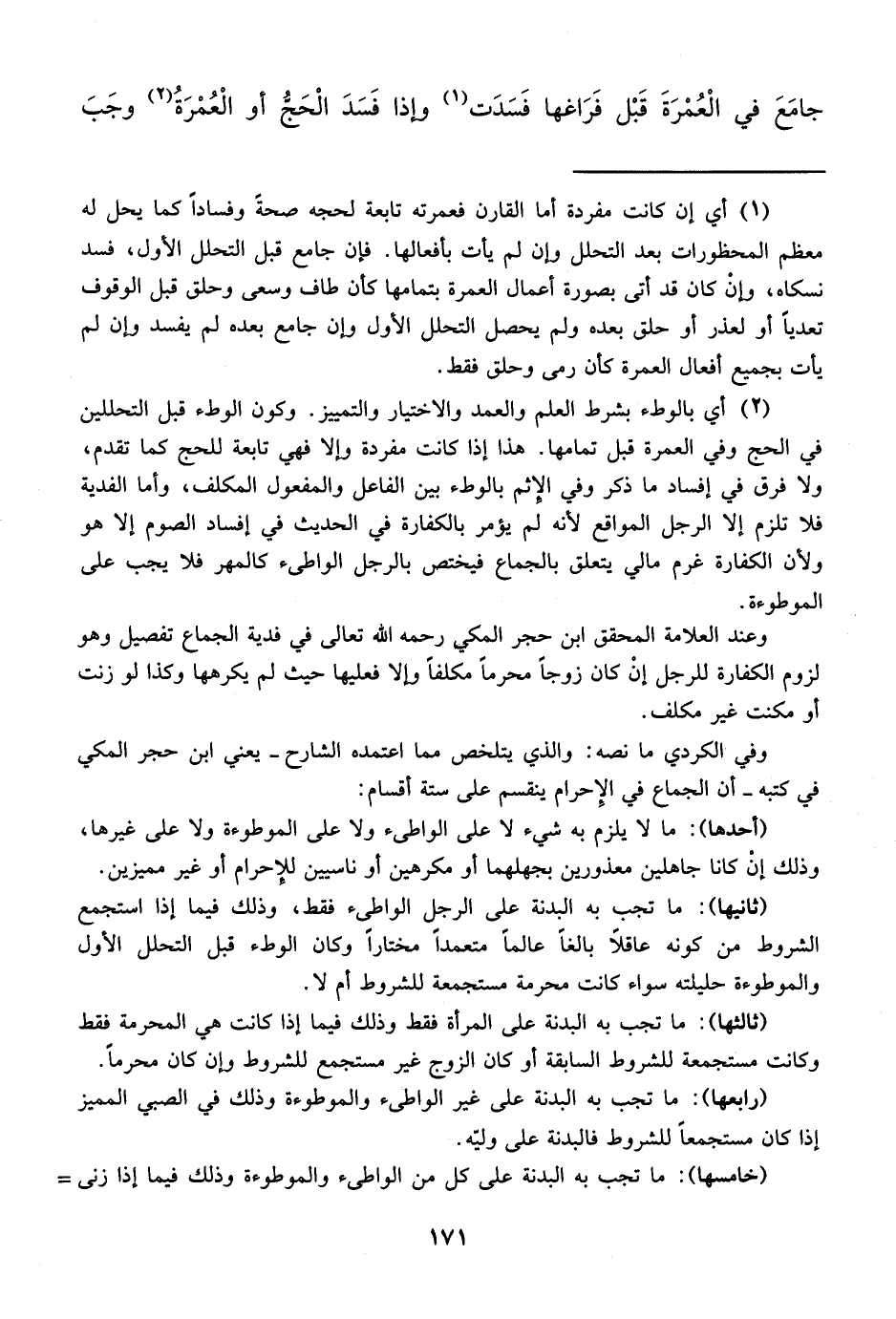 وفي الكردي ما نصه: والذي يتلخص مما اعتمده الشارح -يعني ابن حجر المكي في كتبه- أن الجماع في الإحرام ينقسم على ستة أقسام: