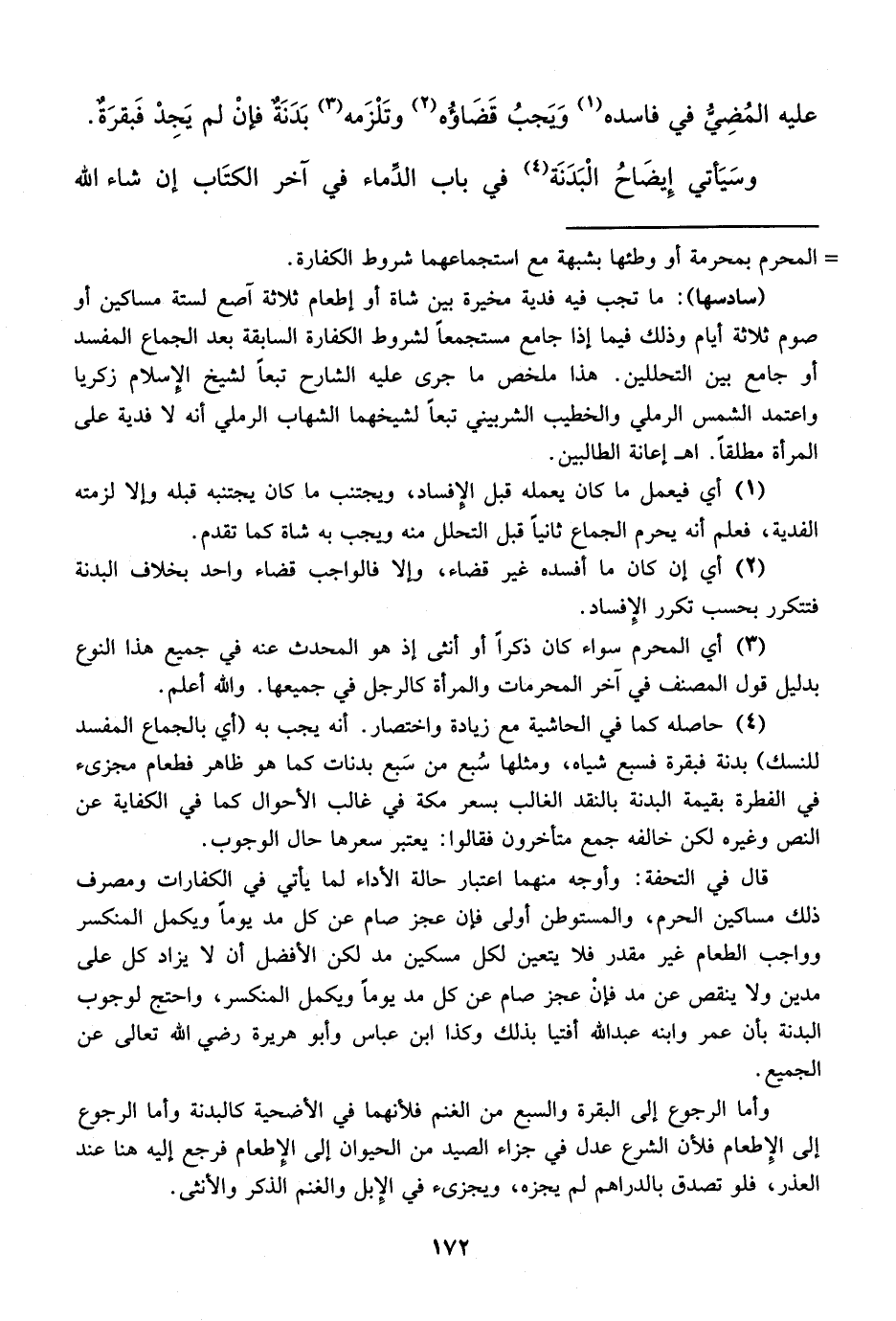 (¬4) حاصله كما في الحاشية مع زيادة واختصار. أنه يجب به (أي بالجماع المفسد للنسك) بدنة فبقرة فسبع شياه، ومثلها سُبع من سَبع بدنات كما هو ظاهر فطعام مجزىء في الفطرة بقيمة البدنة بالنقد الغالب بسعر مكة في غالب الأحوال كما في الكفاية عن النص وغيره لكن خالفه جمع متأخرون فقالوا: يعتبر سعرها حال الوجوب.