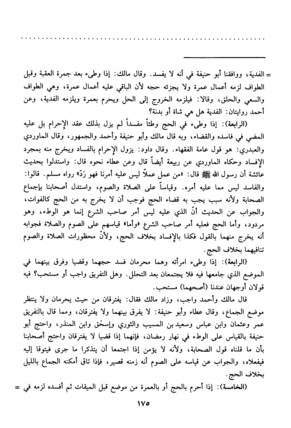 (الرابعة): إذا وطئ في الحج وطئاً مفسداً لم يزل بذلك عقد الإِحرام بل عليه المضي في فاسده والقضاء، وبه قال مالك وأبو حنيفة وأحمد والجمهور، وقال الماوردي والعبدري: هو قول عامة الفقهاء. وقال داود: يزول الإحرام بالفساد ويخرج منه بمجرد الإفساد وحكاه الماوردي عن ربيعة أيضاً قال وعن عطاء نحوه قال: واستدلوا بحديث عائشة أن رسول الله - صلى الله عليه وسلم - قال: "من عمل عملاً ليس عليه أمرنا فهو رَد" رواه مسلم. قالوا: والفاسد ليس مما عليه أمره. وقياساً على الصلاة والصوم، واستدل أصحابنا بإجماع الصحابة ولأنه سبب يجب به قضاء الحج فوجب أن لا يخرج به من الحج كالفوات، والجواب عن الحديث أن الذي عليه ليس أمر صاحب الشرع إنما هو الوطء، وهو مردود، وأما الحج فعليه أمر صاحب الشرع "وأما" قياسهم على الصوم والصلاة فجوابه أنه يخرج منهما بالقول فكذا بالإفساد بخلاف الحج، ولأن محظورات الصلاة والصوم تنافيهما بخلاف الحج.
