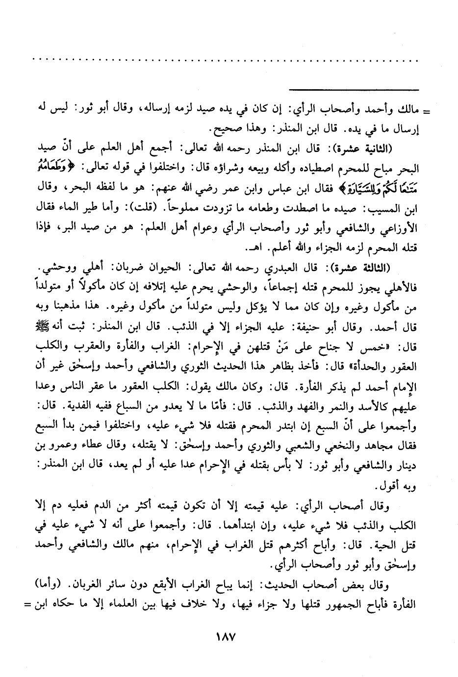 (الثانية عشرة): قال ابن المنذر رحمه الله تعالى: أجمع أهل العلم على أن صيد البحر مباح للمحرم اصطياده وكله وبيعه وشراؤه قال: واختلفوا في قوله تعالى: {وَطَعَامُهُ مَتَاعًا لَكُمْ وَلِلسَّيَّارَةِ} [المائدة: 96] فقال ابن عباس وابن عمر رضي الله عنهم: هو ما لفظه البحر، وقال ابن المسيب: صيده ما اصطدت وطعامه ما تزودت مملوحاً. (قلت): وأما طير الماء فقال الأوزاعي والشافعي وأبو ثور وأصحاب الرأي وعوام أهل العلم: هو من صيد البر، فإذا قتله المحرم لزمه الجزاء والله أعلم. اهـ.